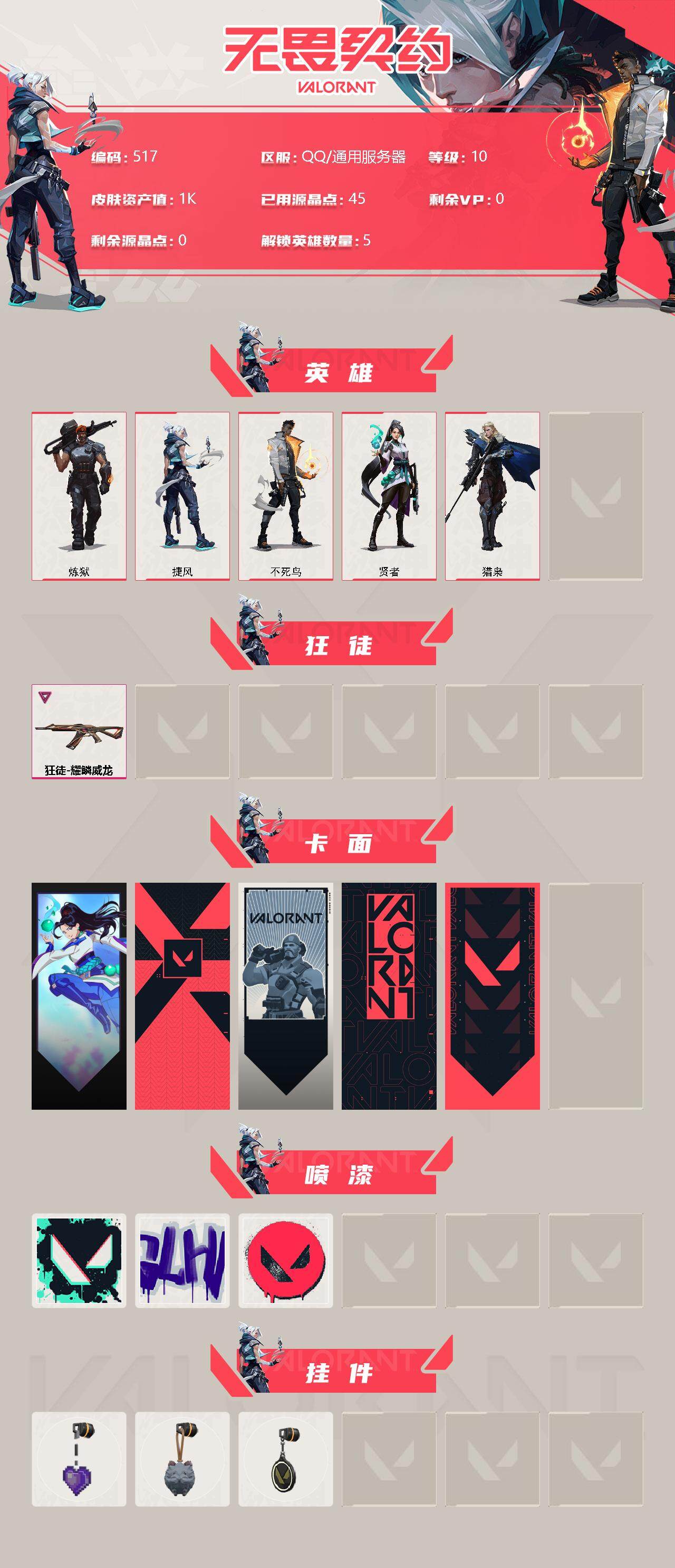 [12958429]【英雄】:炼狱,捷风,不死鸟,贤者,猎枭 【狂徒】:狂徒-耀鳞威龙 【卡面】:无畏契约GO!第一卷:贤者 卡面,代号红色 卡面,新兵报到 卡面,V契约 卡面,无畏契约 卡面 【喷漆】:胜利属于无畏契约 喷漆,GLHF 喷漆,无畏契约 喷漆 【挂饰】:薰衣草之心 挂饰,《双城之战》魄罗 挂饰,无畏契约 纪念币 挂饰