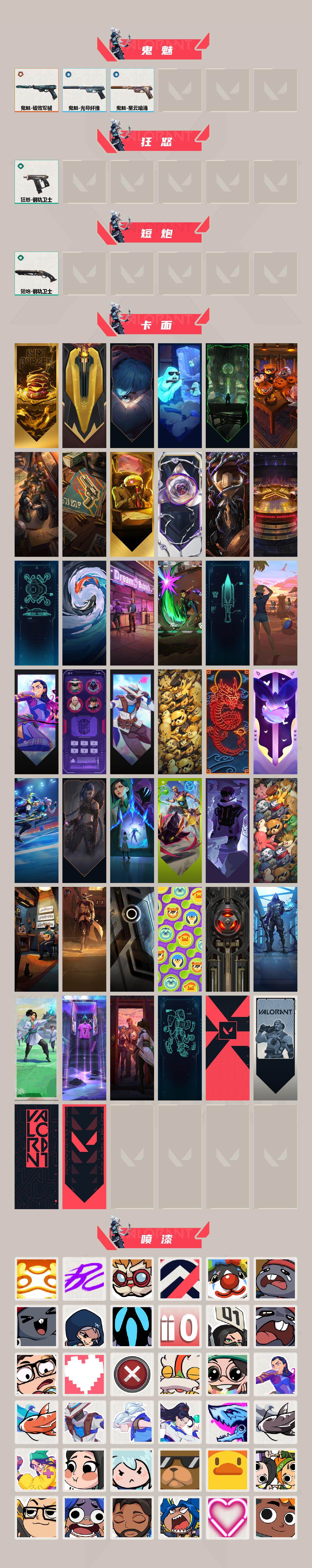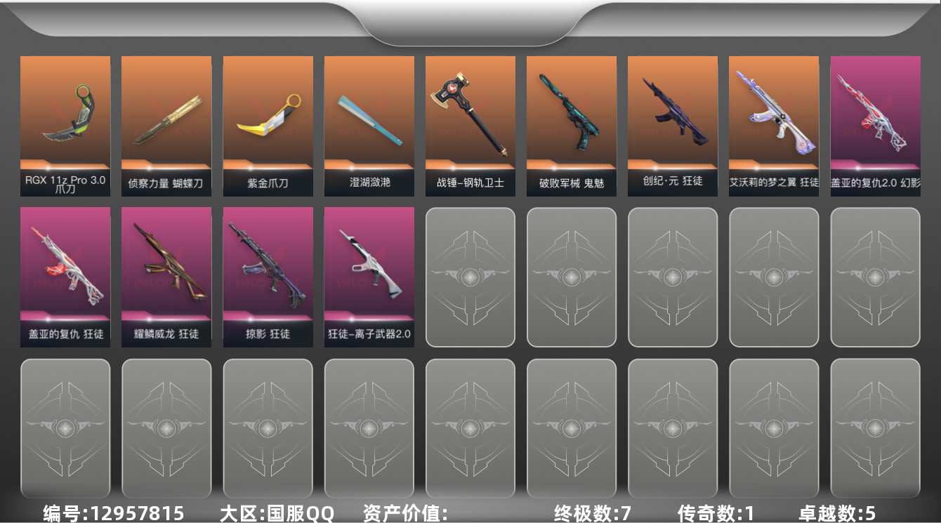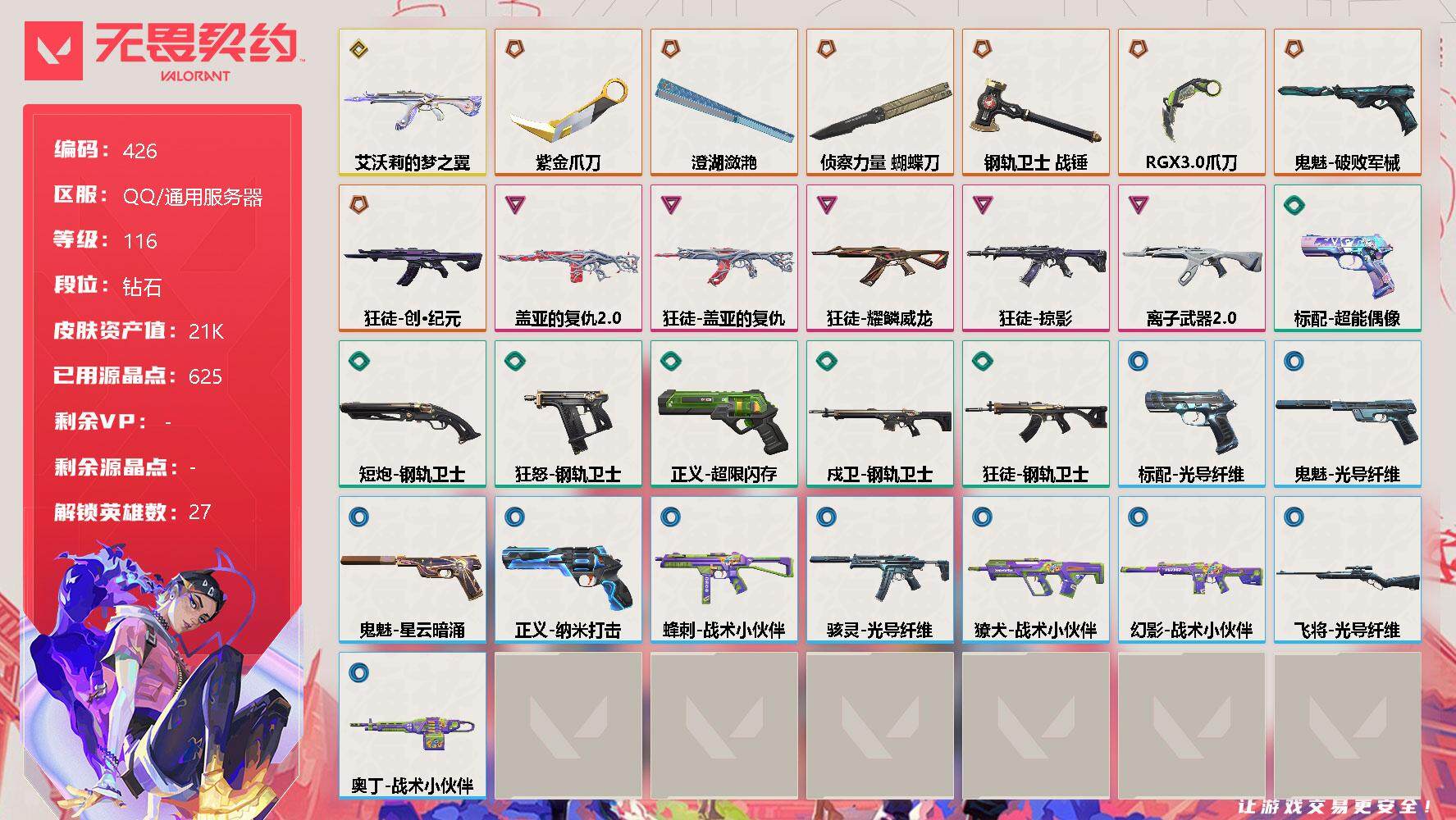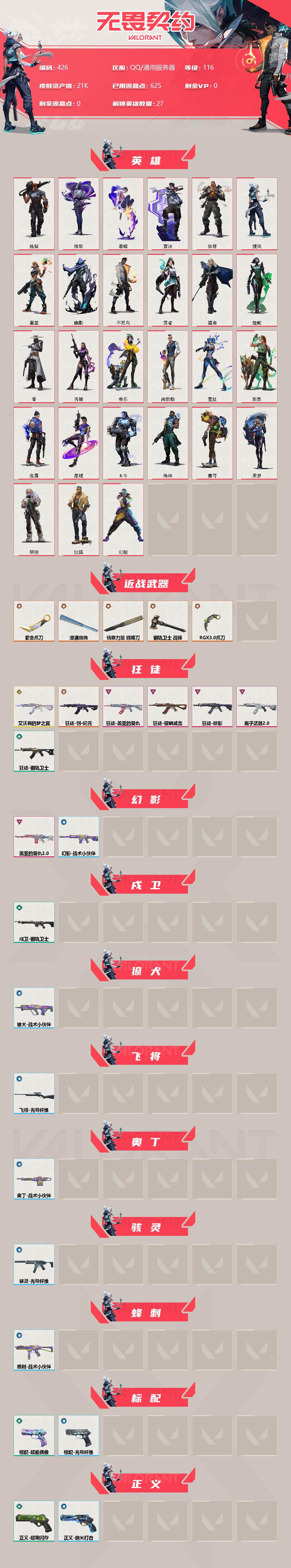 [12957815]【英雄】:幻棱,炼狱,维斯,暮蝶,钛狐,壹决,铁臂,捷风,雷兹,幽影,不死鸟,贤者,猎枭,蝰蛇,零,芮娜,奇乐,尚勃勒,霓虹,斯凯,夜露,星礈,K/O,海神,盖可,黑梦,钢锁 【近战 武器】:近战武器-侦察力量 蝴蝶刀,近战武器-紫金爪刀,近战武器-RGX 11z Pro//3.0 爪刀,近战武器-澄湖潋滟,近战武器-钢轨卫士 战锤 【狂徒】:狂徒-艾沃莉的梦之翼,狂徒-创·纪元,狂徒-掠影,狂徒-盖亚的复仇,狂徒-耀鳞威龙,狂徒-离子武器//2.0,狂徒-钢轨卫士 【幻影】:幻影-盖亚的复仇//2.0,幻影-战术小伙伴 【戍卫】:戍卫-钢轨卫士 【獠犬】:獠犬-战术小伙伴 【飞将】:飞将-光导纤维 【奥丁】:奥丁-战术小伙伴 【骇灵】:骇灵-光导纤维 【蜂刺】:蜂刺-战术小伙伴 【标配】:标配-超能偶像,标配-光导纤维 【正义】:正义-超限闪存,正义-纳米打击 【鬼魅】:鬼魅-破败军械,鬼魅-光导纤维,鬼魅-星云暗涌 【狂怒】:狂怒-钢轨卫士 【短炮】:短炮-钢轨卫士 【卡面】:终章:激斗汉堡 卡面,进入射程 卡面,《双城之战》拥抱 卡面,精灵大战 卡面,欢迎来到底城 卡面,南瓜盛典 卡面,修车达人 卡面,正义的化身 卡面,终章:生意人麦宝 卡面,铁之华 卡面,时间到 卡面,最高舞台 卡面,声感陷阱设计图 卡面,红鳞松叶 卡面,梦幻奶茶 卡面,源能反应 卡面,零点嗅探设计图 卡面,沙雕爆能器 卡面,无畏契约GO!第一卷:芮娜 卡面,清除名单 卡面,无畏契约GO!第一卷:零 卡面,终章:同步耍酷 卡面,龍记 卡面,化茧成蝶 卡面,比比看谁快? 卡面,《双城之战》金克丝 卡面,蝰蛇vs幽影 卡面,势不可挡//盖可 卡面,逆向独行 卡面 ,同步耍酷 卡面,完美调谐 卡面 ,没有什么能逃过我的眼睛 卡面,光导纤维 卡面,战术小伙伴 卡面,钢轨卫士 卡面,暗枪 卡面,夯实根基 卡面,"Luie" 卡面,热烈欢迎 卡面,铁臂设计图 卡面,代号红色 卡面,新兵报到 卡面,V契约 卡面,无畏契约 卡面 【喷漆】:嗨宝南瓜灯 喷漆,嘭! 喷漆,都算到了 喷漆,控场勿近 喷漆,小丑猫 喷漆,熊抱 喷漆,超级粉丝 喷漆,捷风差距 喷漆,惊声尖叫 喷漆,拼一枪 喷漆,我觉得不行 喷漆,我的刀呢? 喷漆,新潮流 喷漆,双击点赞 喷漆,买装还是存钱 喷漆,醒狮贺春 喷漆,萌化了 喷漆,无畏