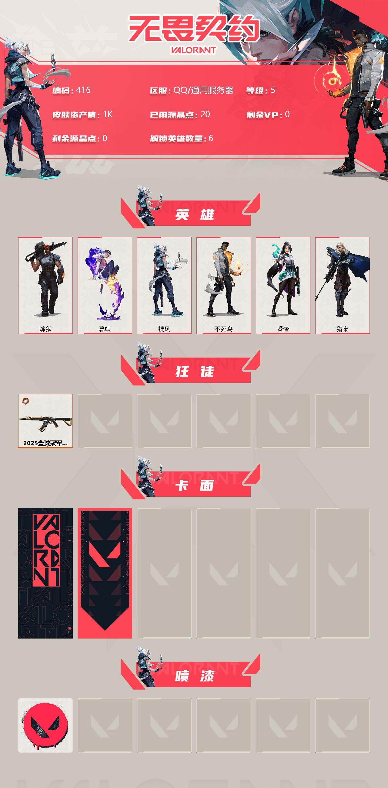 [12957743]【英雄】:炼狱,暮蝶,捷风,不死鸟,贤者,猎枭 【狂徒】:狂徒-2025全球冠军赛 【卡面】:V契约 卡面,无畏契约 卡面 【喷漆】:无畏契约 喷漆