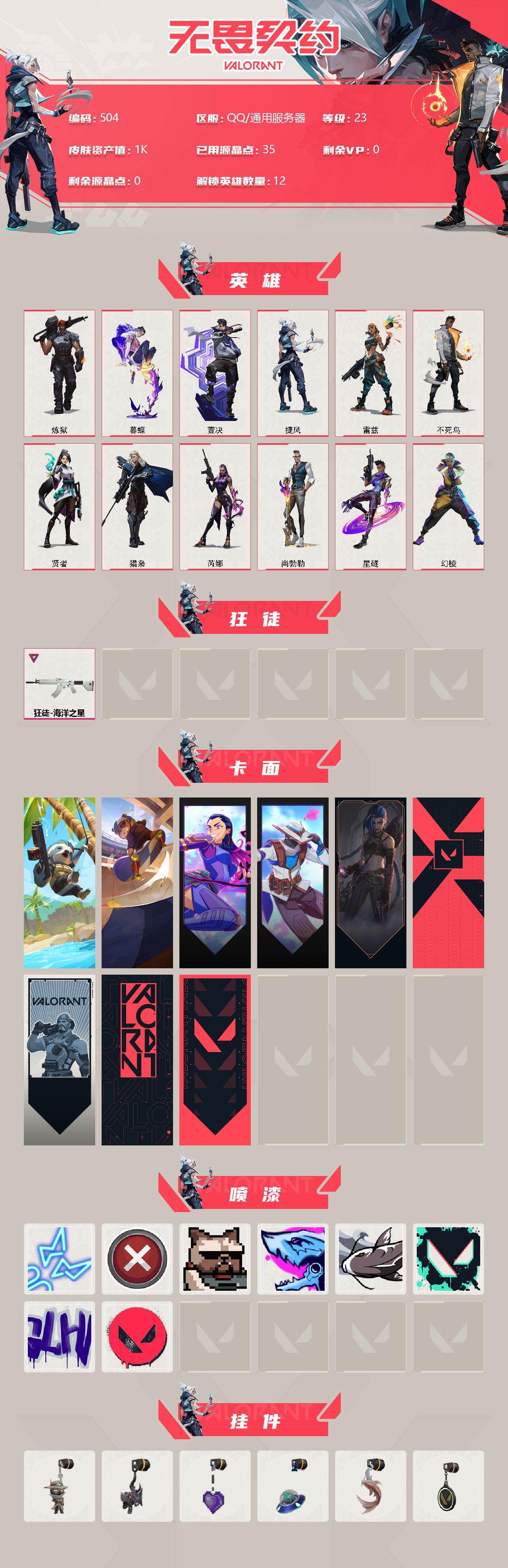 [12958284]【英雄】:幻棱,炼狱,暮蝶,壹决,捷风,雷兹,不死鸟,贤者,猎枭,芮娜,尚勃勒,星礈 【狂徒】:狂徒-海洋之星 【卡面】:树懒大作战 卡面,Clutch 卡面,无畏契约GO!第一卷:芮娜 卡面,无畏契约GO!第一卷:零 卡面,《双城之战》金克丝 卡面,代号红色 卡面,新兵报到 卡面,V契约 卡面,无畏契约 卡面 【喷漆】:霓光四射 喷漆,买装还是存钱 喷漆,关门放狗 喷漆,暴走萝莉 喷漆,松叶 喷漆,胜利属于无畏契约 喷漆,GLHF 喷漆,无畏契约 喷漆 【挂饰】:无畏契约GO!第一卷 零 挂饰,鱼骨头 挂饰,薰衣草之心 挂饰,天外飞客 挂饰,红鳞松叶 挂饰,无畏契约 纪念币 挂饰