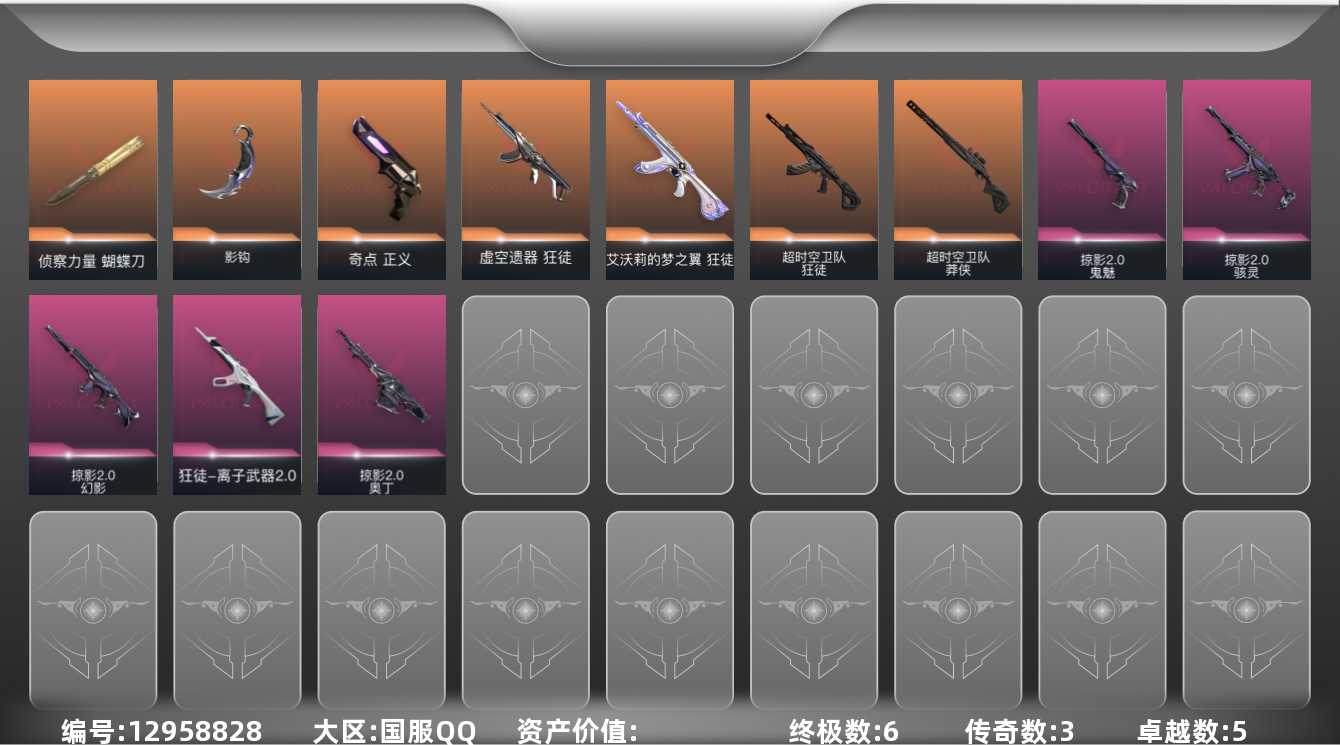 [12958828]【套装】:掠影//2.0套装 【英雄】:炼狱,暮蝶,壹决,捷风,不死鸟,贤者,猎枭,蝰蛇,零,芮娜,尚勃勒,霓虹,K/O 【近战 武器】:近战武器-影钩,近战武器-侦察力量 蝴蝶刀 【狂徒】:狂徒-艾沃莉的梦之翼,狂徒-超时空卫队,狂徒-虚空遗器,狂徒-离子武器//2.0 【幻影】:幻影-掠影//2.0 【莽侠】:莽侠-超时空卫队 【奥丁】:奥丁-掠影//2.0 【骇灵】:骇灵-掠影//2.0 【正义】:正义-奇点 【鬼魅】:鬼魅-掠影//2.0 【卡面】:无畏契约:暮蝶 卡面,无畏契约:尚勃勒 卡面,无畏契约GO!第一卷:芮娜 卡面,《双城之战》金克丝 卡面,代号红色 卡面,新兵报到 卡面,V契约 卡面,无畏契约 卡面 【喷漆】:伤心心 喷漆,致命优雅 喷漆,买装还是存钱 喷漆,放下武器 喷漆,胜利属于无畏契约 喷漆,GLHF 喷漆,无畏契约 喷漆 【挂饰】:无畏契约GO!第一卷 芮娜 挂饰,天外飞客 挂饰,无畏契约 纪念币 挂饰