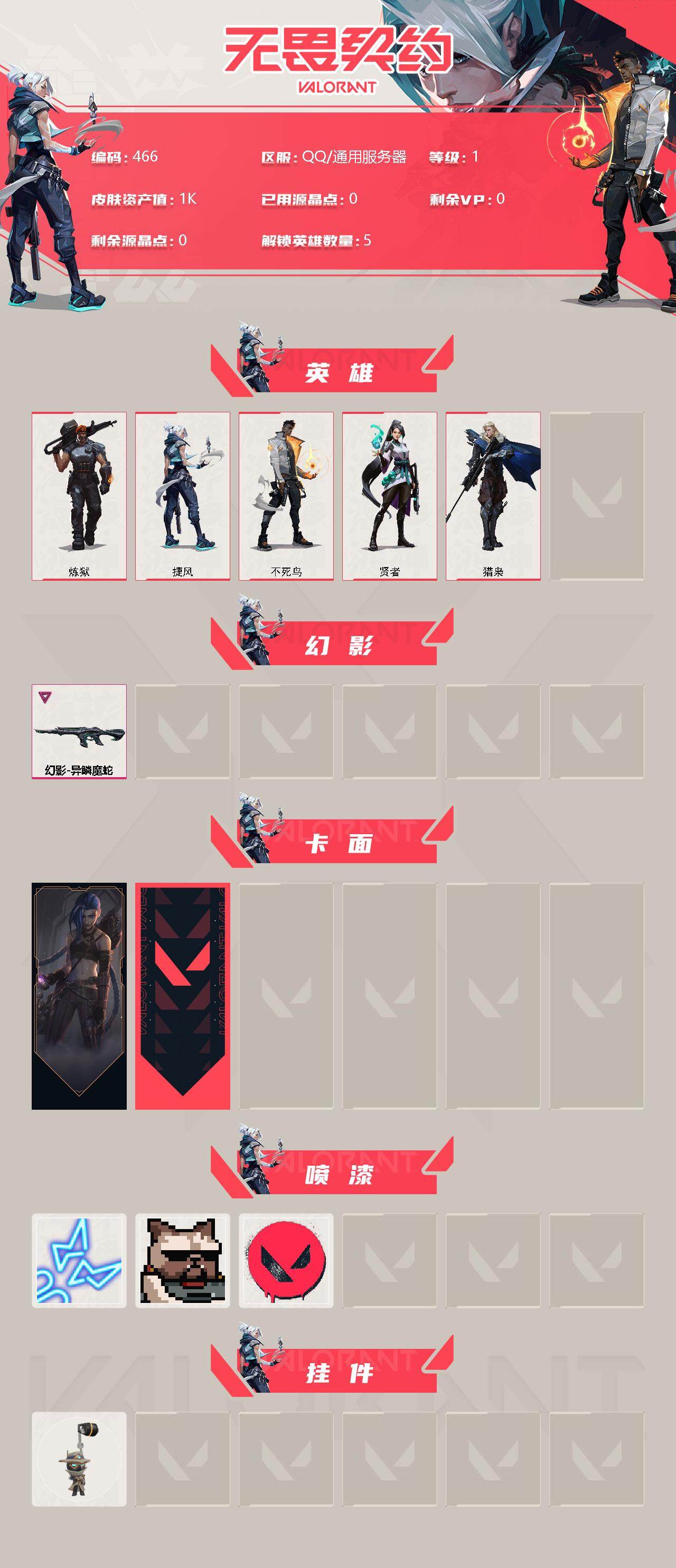 [12958020]【英雄】:炼狱,捷风,不死鸟,贤者,猎枭 【幻影】:幻影-异鳞魔蛇 【卡面】:《双城之战》金克丝 卡面,无畏契约 卡面 【喷漆】:霓光四射 喷漆,关门放狗 喷漆,无畏契约 喷漆 【挂饰】:无畏契约GO!第一卷 零 挂饰