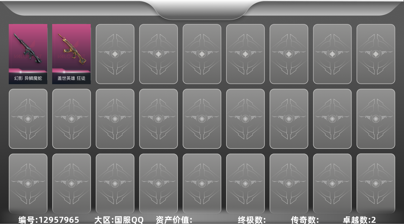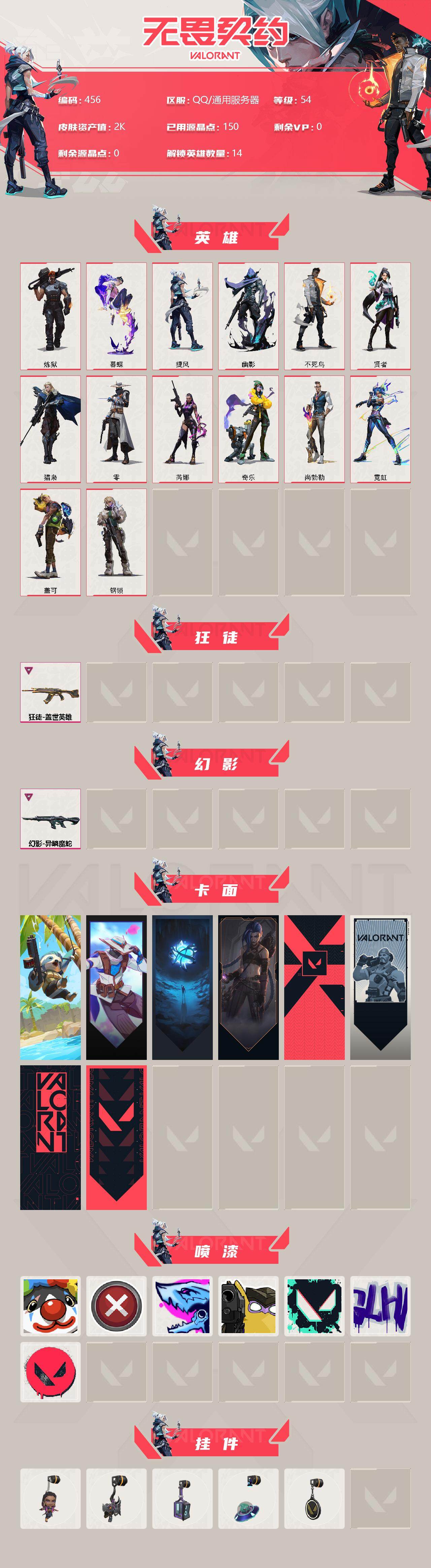 [12957965]【英雄】:炼狱,暮蝶,捷风,幽影,不死鸟,贤者,猎枭,零,芮娜,奇乐,尚勃勒,霓虹,盖可,钢锁 【狂徒】:狂徒-盖世英雄 【幻影】:幻影-异鳞魔蛇 【卡面】:树懒大作战 卡面,无畏契约GO!第一卷:零 卡面,无垠星环 卡面,《双城之战》金克丝 卡面,代号红色 卡面,新兵报到 卡面,V契约 卡面,无畏契约 卡面 【喷漆】:小丑猫 喷漆,买装还是存钱 喷漆,暴走萝莉 喷漆,放下武器 喷漆,胜利属于无畏契约 喷漆,GLHF 喷漆,无畏契约 喷漆 【挂饰】:无畏契约GO!第一卷 芮娜 挂饰,鱼骨头 挂饰,动力机箱 挂饰,天外飞客 挂饰,无畏契约 纪念币 挂饰