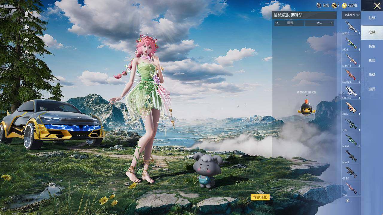 AKM-绿萝繁花,M416-电玩时刻,AUG-暖羊咩咩,M762-青锋波束,Kar98K-巳巳如意