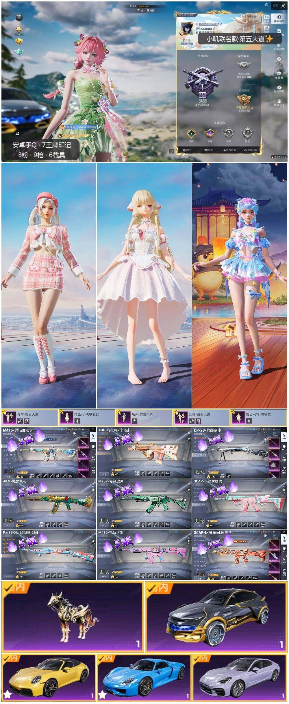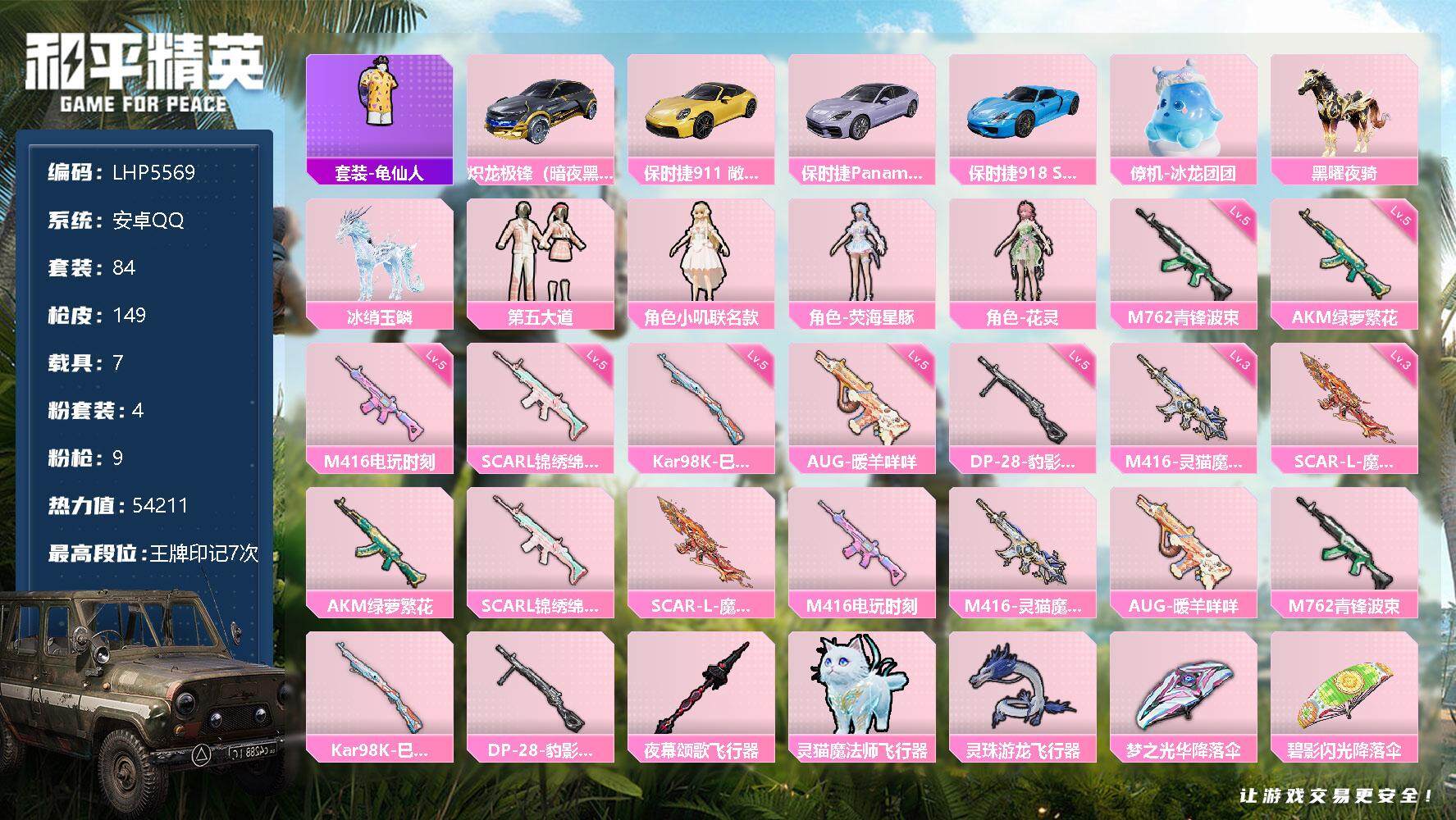 [12956212]素材身法号 安卓 手Q-4粉装-9特效枪-7载具-4粉色飞行器-5.4w热力值-7王牌印记-84套装-149枪皮【热门品类】:套装-龟仙人【粉色载具】:炽龙极锋(暗夜黑),保时捷911 敞篷版(极速黄),保时捷Panamera(星辰紫),保时捷918 Spyder(沉静蓝),僚机-冰龙团团,黑曜夜骑,冰绡玉鳞【粉色套装】:粉装-第五大道,角色-小叽联名款,角色-荧海星豚,角色-花灵【粉色枪皮等级】:AKM-绿萝繁花(五级),SCAR-L-锦绣绵绵(五级),SCAR-L-魔童闹海 哪吒(三级),M416-电玩时刻(五级),M416-灵猫魔法师(三级),AUG-暖羊咩咩(五级),M762-青锋波束(五级),Kar98K-巳巳如意(五级),DP-28-豹影疾电(五级)【粉色飞行器】:夜幕颂歌飞行器,灵猫魔法师飞行器,灵珠游龙飞行器