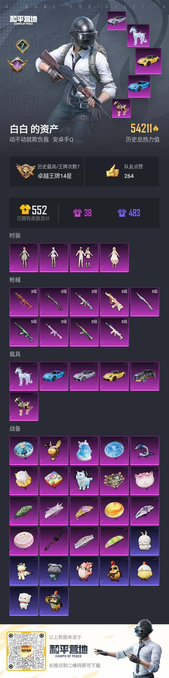 - PX_2060546- 安卓手Q-3王牌印记-6粉装-4特效枪-1载具-27242热力值-59套装-57枪皮-0卓越印记-0传奇印记 【6粉装】,暗夜玫瑰,沙场疾风,俏雪含霜,海渊国主,吟月归客,天之羽翼 【4特效枪】M416-风花雪月-4级 SLR-暗夜玫瑰-2级 DP-28-扶摇飞仙-3级 MG3-洛神天依-2级 【3稀有紫装】,暗影哥特,龟仙人,暗夜魅影, 【1稀有载具】,兰博基尼Esto