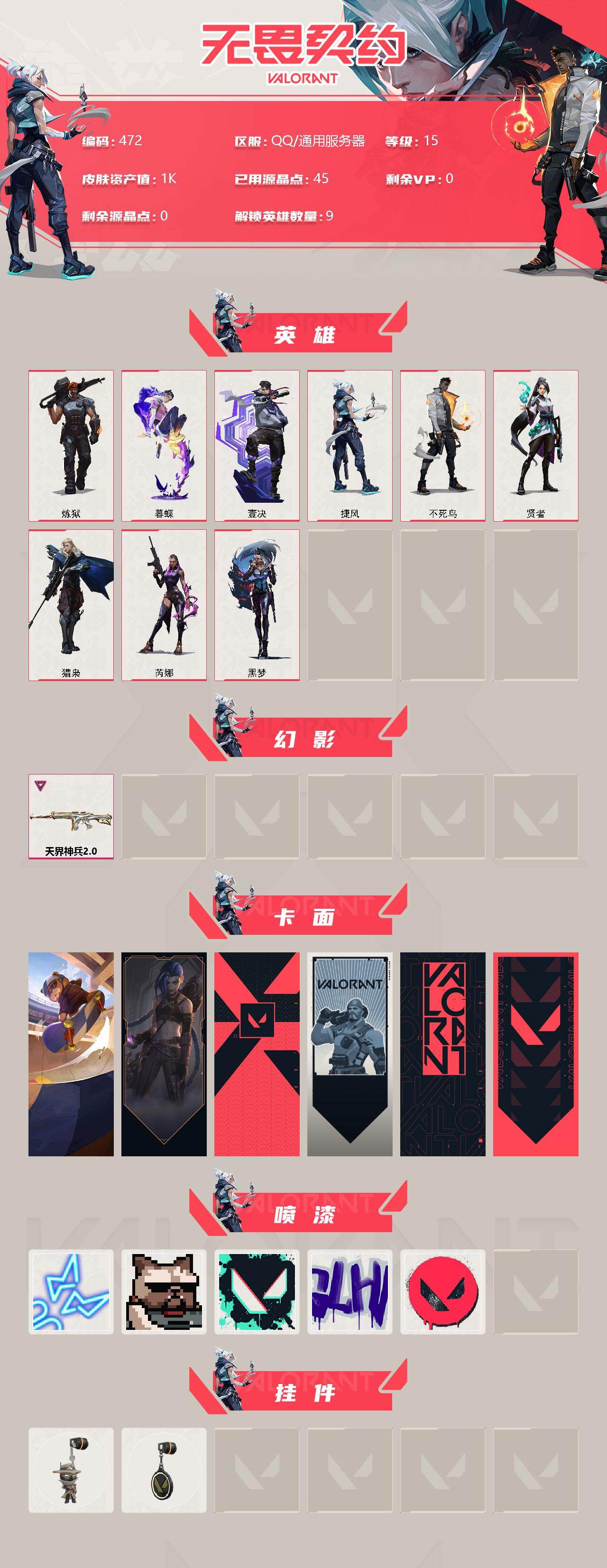 [12958080]【英雄】:炼狱,暮蝶,壹决,捷风,不死鸟,贤者,猎枭,芮娜,黑梦 【幻影】:幻影-天界神兵//2.0 【卡面】:Clutch 卡面,《双城之战》金克丝 卡面,代号红色 卡面,新兵报到 卡面,V契约 卡面,无畏契约 卡面 【喷漆】:霓光四射 喷漆,关门放狗 喷漆,胜利属于无畏契约 喷漆,GLHF 喷漆,无畏契约 喷漆 【挂饰】:无畏契约GO!第一卷 零 挂饰,无畏契约 纪念币 挂饰
