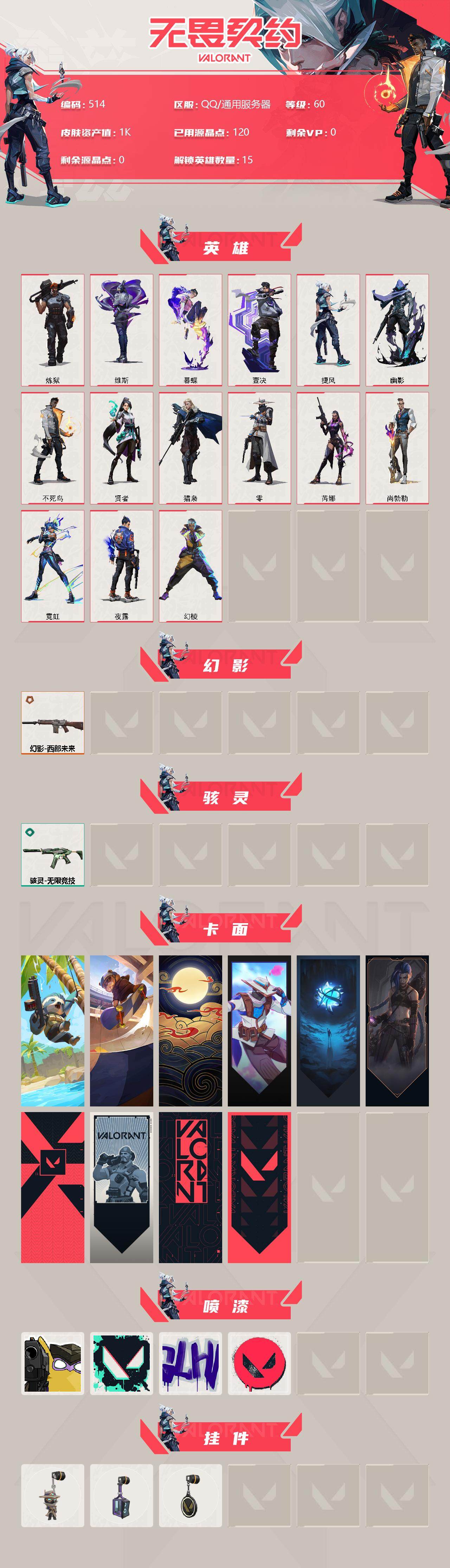 [12958411]【英雄】:幻棱,炼狱,维斯,暮蝶,壹决,捷风,幽影,不死鸟,贤者,猎枭,零,芮娜,尚勃勒,霓虹,夜露 【幻影】:幻影-西部未来,幻影-西部未来 【骇灵】:骇灵-无限竞技 【卡面】:树懒大作战 卡面,Clutch 卡面,纤云弄巧 卡面,无畏契约GO!第一卷:零 卡面,无垠星环 卡面,《双城之战》金克丝 卡面,代号红色 卡面,新兵报到 卡面,V契约 卡面,无畏契约 卡面 【喷漆】:放下武器 喷漆,胜利属于无畏契约 喷漆,GLHF 喷漆,无畏契约 喷漆 【挂饰】:无畏契约GO!第一卷 零 挂饰,动力机箱 挂饰,无畏契约 纪念币 挂饰