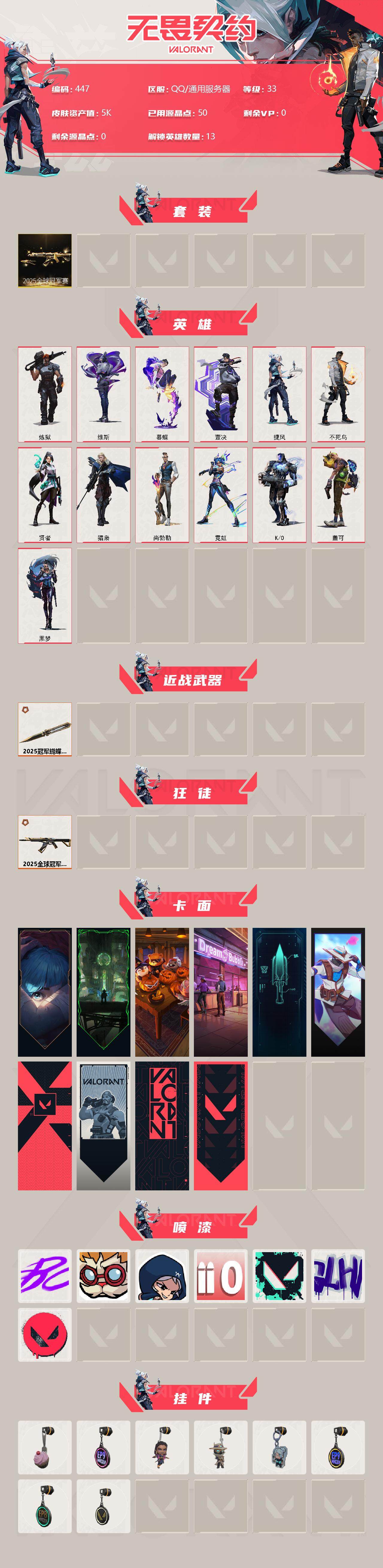 [12957936]【套装】:2025全球冠军赛套装 【英雄】:炼狱,维斯,暮蝶,壹决,捷风,不死鸟,贤者,猎枭,尚勃勒,霓虹,K/O,盖可,黑梦 【近战 武器】:近战武器-2025全球冠军赛 蝴蝶刀 【狂徒】:狂徒-2025全球冠军赛 【卡面】:《双城之战》拥抱 卡面,欢迎来到底城 卡面,南瓜盛典 卡面,梦幻奶茶 卡面,零点嗅探设计图 卡面,无畏契约GO!第一卷:零 卡面,代号红色 卡面,新兵报到 卡面,V契约 卡面,无畏契约 卡面 【喷漆】:嘭! 喷漆,都算到了 喷漆,捷风差距 喷漆,拼一枪 喷漆,胜利属于无畏契约 喷漆,GLHF 喷漆,无畏契约 喷漆 【挂饰】:《双城之战》小蛋糕 挂饰,第九季//第三幕 纪念币 挂饰,无畏契约GO!第一卷 芮娜 挂饰,无畏契约GO!第一卷 零 挂饰,袖珍捷风 挂饰,第九季//第一幕 纪念币 挂饰,第八季//第三幕 纪念币 挂饰,无畏契约 纪念币 挂饰