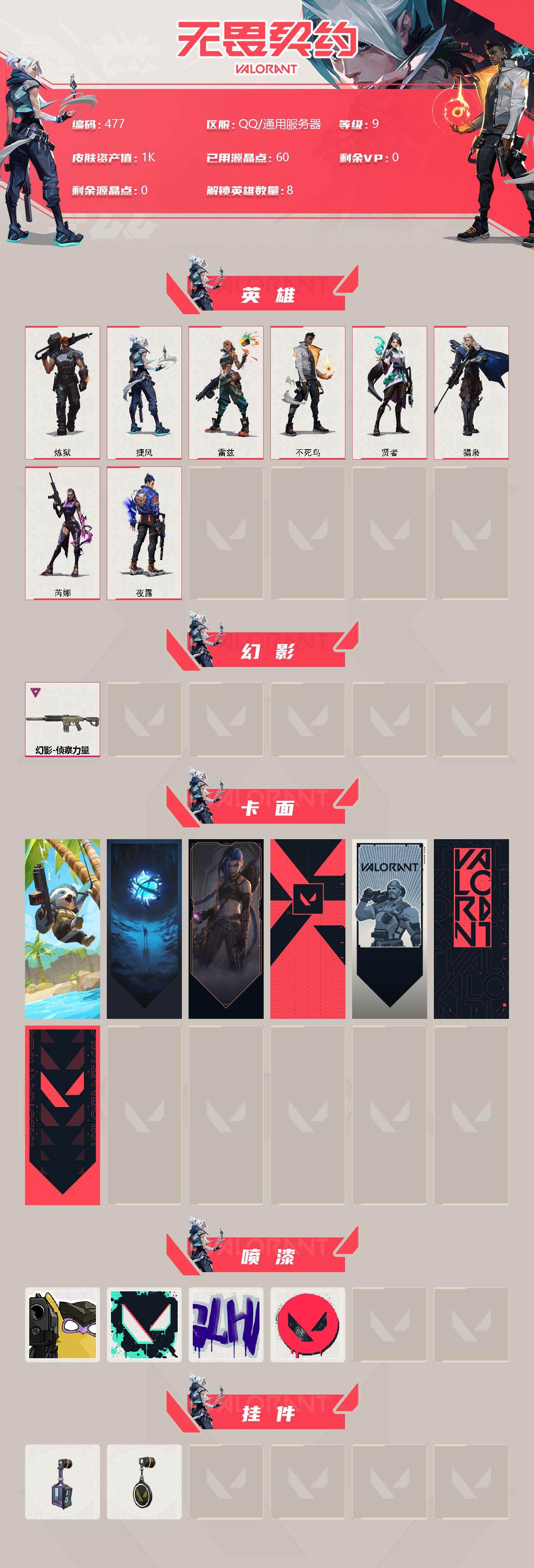 [12958115]【英雄】:炼狱,捷风,雷兹,不死鸟,贤者,猎枭,芮娜,夜露 【幻影】:幻影-侦察力量 【卡面】:树懒大作战 卡面,无垠星环 卡面,《双城之战》金克丝 卡面,代号红色 卡面,新兵报到 卡面,V契约 卡面,无畏契约 卡面 【喷漆】:放下武器 喷漆,胜利属于无畏契约 喷漆,GLHF 喷漆,无畏契约 喷漆 【挂饰】:动力机箱 挂饰,无畏契约 纪念币 挂饰