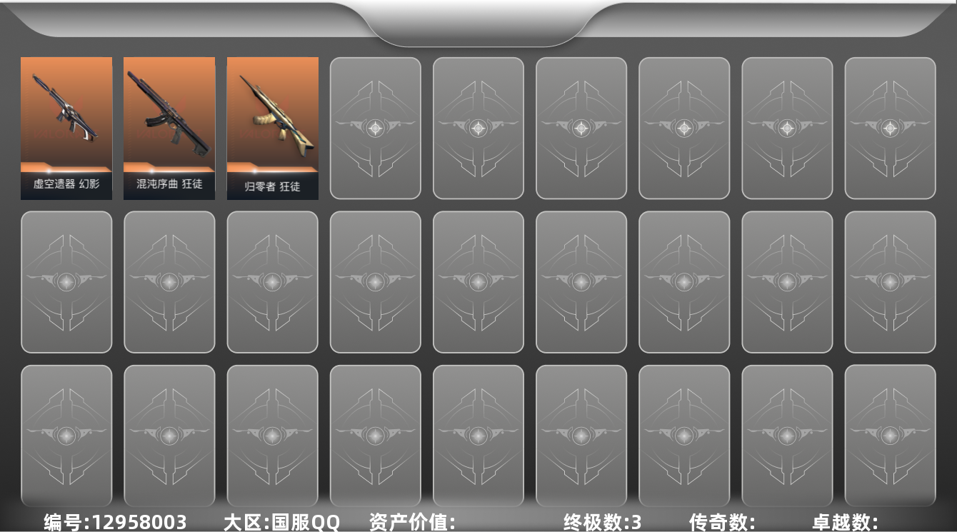 - [12056569]总资产:178.8M 8传说枪械 哈夫币:158K 高级安全箱(9.17到期) 可二次 可修改实名 烽火地带段位:黄金 全面战场段位:无段位 传说武器皮肤:AWM狙击步枪-捞点薯条,腾龙突击步枪-捞点薯条,93R-捞点薯条,勇士冲锋枪-能天使-午夜邮差,复合弓-黑-天际线,725双管霰弹枪-送葬人-无题密令,M4A1突击步枪-阿米娅,CAR-15突击步枪-阿米娅