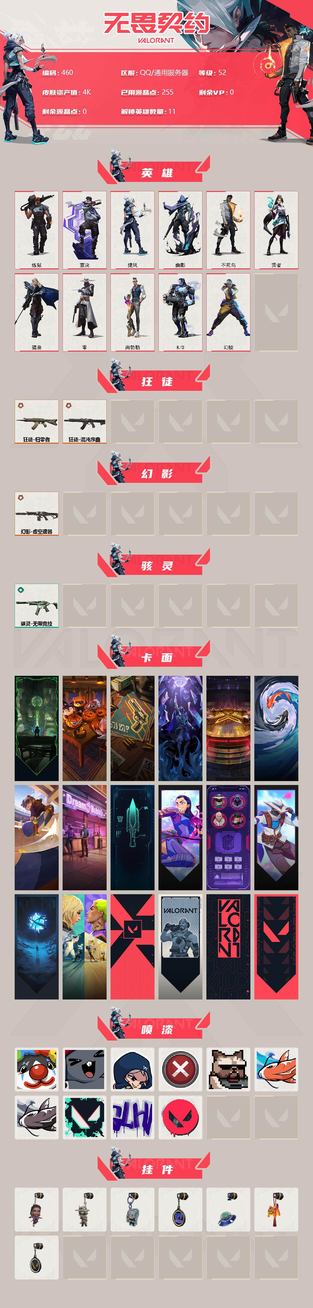 [12958003]【英雄】:幻棱,炼狱,壹决,捷风,幽影,不死鸟,贤者,猎枭,零,尚勃勒,K/O 【狂徒】:狂徒-归零者,狂徒-混沌序曲 【幻影】:幻影-虚空遗器 【骇灵】:骇灵-无限竞技 【卡面】:欢迎来到底城 卡面,南瓜盛典 卡面,正义的化身 卡面,失而复得 卡面,最高舞台 卡面,红鳞松叶 卡面,Clutch 卡面,梦幻奶茶 卡面,零点嗅探设计图 卡面,无畏契约GO!第一卷:芮娜 卡面,清除名单 卡面,无畏契约GO!第一卷:零 卡面,无垠星环 卡面,钢锁vs盖可 卡面,代号红色 卡面,新兵报到 卡面,V契约 卡面,无畏契约 卡面 【喷漆】:小丑猫 喷漆,超级粉丝 喷漆,捷风差距 喷漆,买装还是存钱 喷漆,关门放狗 喷漆,红鳞 喷漆,松叶 喷漆,胜利属于无畏契约 喷漆,GLHF 喷漆,无畏契约 喷漆 【挂饰】:无畏契约GO!第一卷 芮娜 挂饰,无畏契约GO!第一卷 零 挂饰,袖珍捷风 挂饰,第九季//第一幕 纪念币 挂饰,天外飞客 挂饰,好运福爪 挂饰,无畏契约 纪念币 挂饰