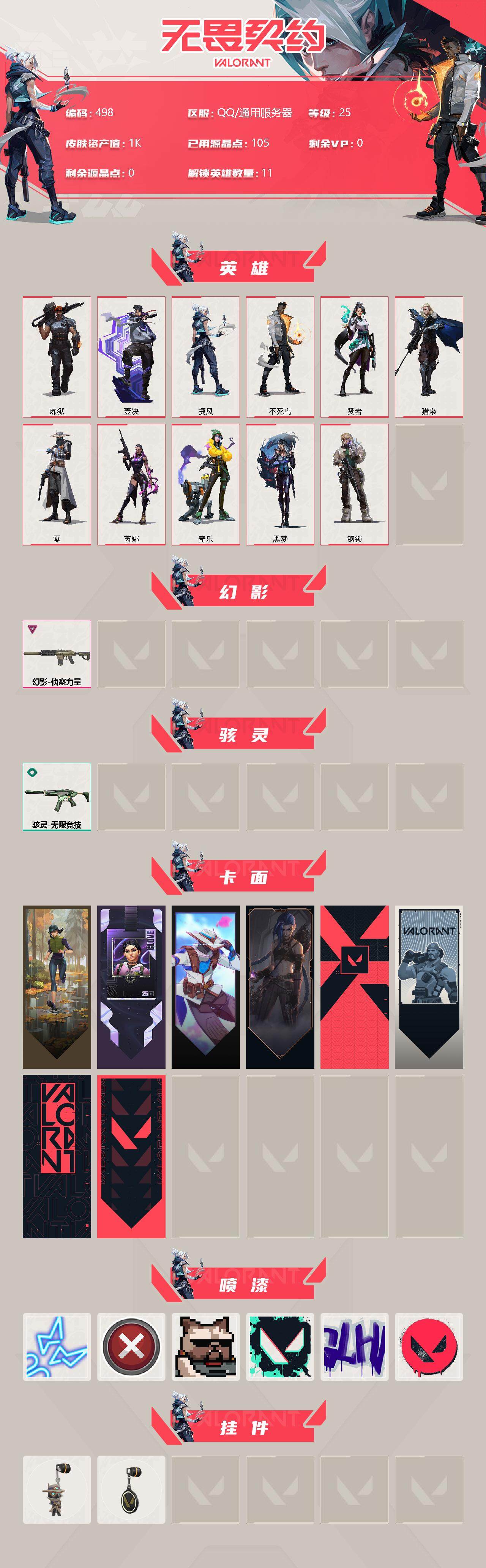 [12958235]【英雄】:炼狱,壹决,捷风,不死鸟,贤者,猎枭,零,芮娜,奇乐,黑梦,钢锁 【幻影】:幻影-侦察力量 【骇灵】:骇灵-无限竞技 【卡面】:归乡 // 蝰蛇 卡面,暮蝶工牌 卡面,无畏契约GO!第一卷:零 卡面,《双城之战》金克丝 卡面,代号红色 卡面,新兵报到 卡面,V契约 卡面,无畏契约 卡面 【喷漆】:霓光四射 喷漆,买装还是存钱 喷漆,关门放狗 喷漆,胜利属于无畏契约 喷漆,GLHF 喷漆,无畏契约 喷漆 【挂饰】:无畏契约GO!第一卷 零 挂饰,无畏契约 纪念币 挂饰