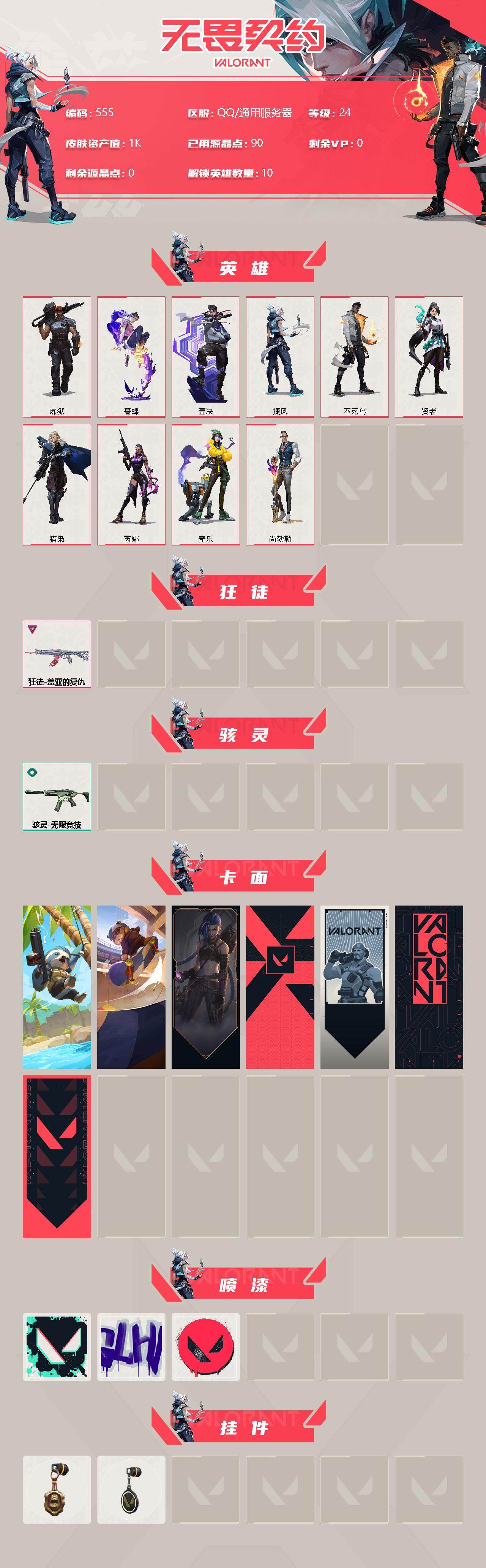 [12958684]【英雄】:炼狱,暮蝶,壹决,捷风,不死鸟,贤者,猎枭,芮娜,奇乐,尚勃勒 【狂徒】:狂徒-盖亚的复仇 【骇灵】:骇灵-无限竞技 【卡面】:树懒大作战 卡面,Clutch 卡面,《双城之战》金克丝 卡面,代号红色 卡面,新兵报到 卡面,V契约 卡面,无畏契约 卡面 【喷漆】:胜利属于无畏契约 喷漆,GLHF 喷漆,无畏契约 喷漆 【挂饰】:海豹的认可 挂饰,无畏契约 纪念币 挂饰