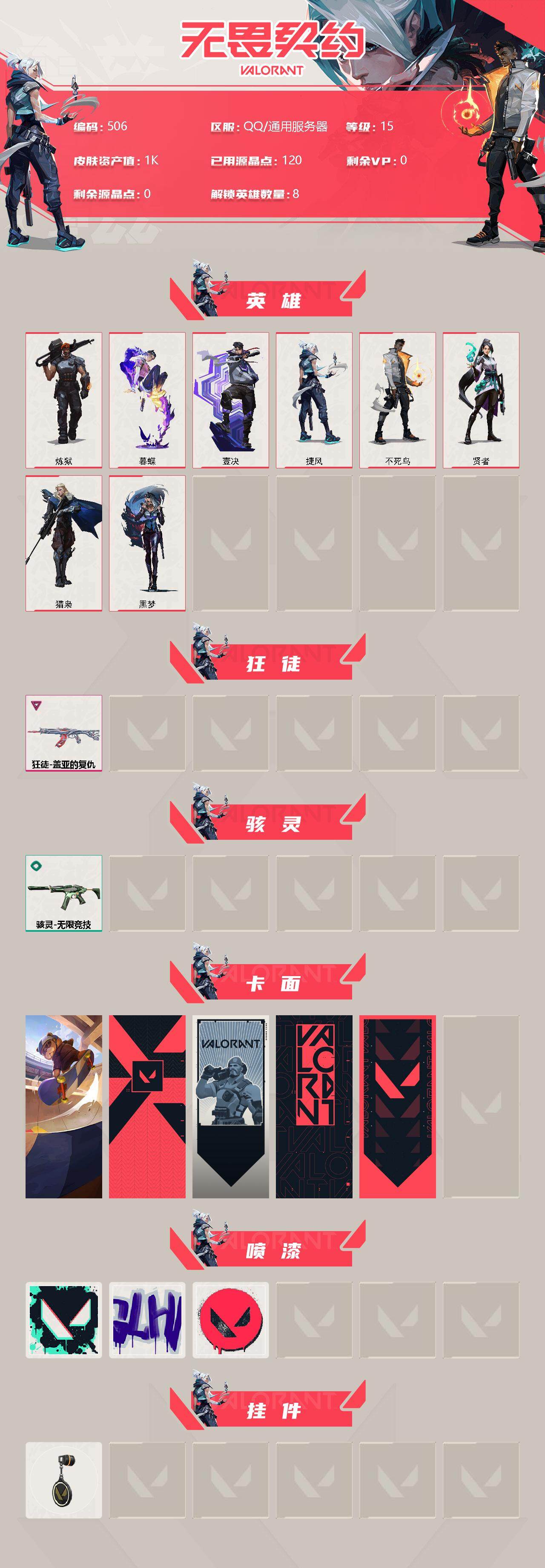 [12958295]【英雄】:炼狱,暮蝶,壹决,捷风,不死鸟,贤者,猎枭,黑梦 【狂徒】:狂徒-盖亚的复仇 【骇灵】:骇灵-无限竞技 【卡面】:Clutch 卡面,代号红色 卡面,新兵报到 卡面,V契约 卡面,无畏契约 卡面 【喷漆】:胜利属于无畏契约 喷漆,GLHF 喷漆,无畏契约 喷漆 【挂饰】:无畏契约 纪念币 挂饰