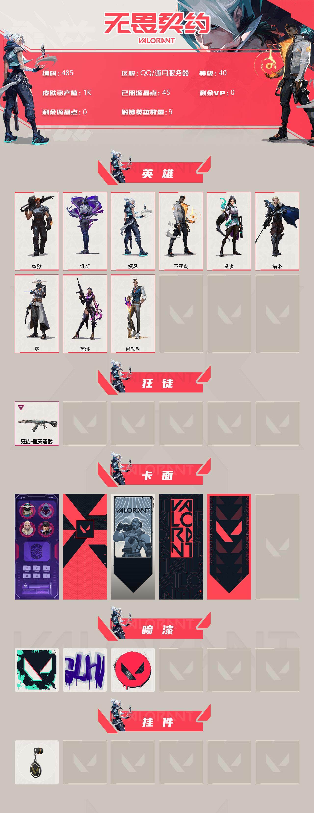 [12958163]【英雄】:炼狱,维斯,捷风,不死鸟,贤者,猎枭,零,芮娜,尚勃勒 【狂徒】:狂徒-堕天遗武 【卡面】:清除名单 卡面,代号红色 卡面,新兵报到 卡面,V契约 卡面,无畏契约 卡面 【喷漆】:胜利属于无畏契约 喷漆,GLHF 喷漆,无畏契约 喷漆 【挂饰】:无畏契约 纪念币 挂饰