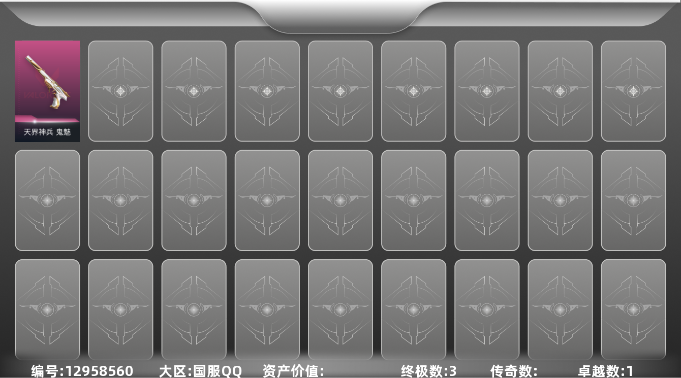 - [13080603]河北一区-49V-13王者-0炫金 【传说武器】:传说灵眸 【传说角色】:传说女帝,传说艾莉莎 【热门武器】:传说灵眸,QBZ03-金色蔷薇,M200-幻神,柯尔特-冠军之特*2,M4A1-黑骑士,USP-雷暴,沙鹰-修罗,Knife-冠军之刃*2 【音效卡】:屠龙-动感闪耀 音效卡,Barrett-毁灭音效卡,AWM-裁决音效卡,炼狱-百战金芒-庆典舞曲音效卡 【皮肤】:幻神-AG-CFPLS17冠军,幻神-宠儿-2021MVP,幻神-降龙,QBZ03-冠军之薇,裁决-运输船 皮肤,雷神-荣耀之魄,雷神-脉冲核心,火麒麟-冠军之心,火麒麟-心动糖果,毁灭-荣耀之怒,黑龙-冠军之武,黑骑士-暗月,黑骑士-AG-S4冠军典藏,修罗-冠军之魂,屠龙-春桃 皮肤,屠龙-巅峰荣耀 皮肤,屠龙-惊鸿 皮肤,炽芒蝶刃-巅峰荣耀 皮肤 【角色】:审判者,电竞教官-云悠悠,隼,战地猎狐,乔伊教练,云海玲珑,王者潘多拉,灵狐者-职业经理*2,幽,新灵狐者,铁骑荣耀 【人偶武器】:Barrett-夜玫瑰,COP-旗袍,迷你巨石泰坦-魔花研究所,迷你火种*2,生化手雷-机甲核心 【暴走生化】:黑龙吞噬者,超级对讲机 【挑战大师】:激光毁灭者III,机甲撕裂者III,试炼破坏者III,神圣爆裂者-末日III 【英雄级武器】:AK47-火麒麟*2,M4A1-黑龙,M4A1-雷神,M4A1-黑骑士,AK12-天启,M4A1-神工天巧,QBZ03-独角-V,QBZ03-金色蔷薇,王者之魄-觉醒版,白虎之魄-觉醒版,王者芳薇-觉醒版,Barrett-毁灭,Barrett-极光,AWM-裁决,M200-幻神,王者风神-觉醒版,炼狱-百战金芒,悦蓝-惊涛骇浪-觉醒版,沙鹰-修罗,USP-雷暴,柯尔特-冠军之特*2,柯尔特-竞技荣光,USP-神工天巧,天神-动感闪耀,屠龙,屠龙-动感闪耀,麒麟刺-百战金芒,高爆手雷-竞技荣光,高爆手雷-神工天巧*3,高爆手雷-雷霆王者*2,闪光弹-竞技荣光*2,闪光弹-神工天巧*6,闪光弹-雷暴王者*2,烟雾弹-竞技荣光*2,烟雾弹-神工天巧*5,烟雾弹-雷暴王者,M4A1-赤狱骑士 【特殊枪械】:1黑骑士
