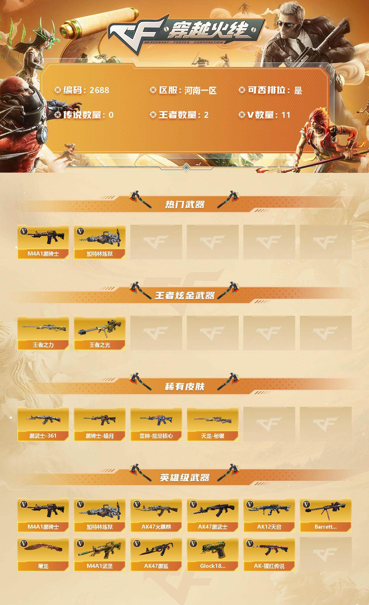 [12958405]河南一区-11V-2王者-0炫金 【热门武器】:M4A1-黑骑士,加特林-炼狱 【王者炫金武器】:王者之光,王者之力 【稀有皮肤】:雷神-能量核心,黑骑士-暗月,天龙-秘银,AK47-黑武士-361 【英雄级武器】:M4A1-武圣,Glock18-武圣,M4A1-黑骑士,加特林-炼狱,AK47-火麒麟,AK47-黑武士,AK12-天启,Barrett-毁灭,AK47-黑鲨,AK-47-猩红传说,屠龙 【特殊枪械】:1黑骑士,1炼狱