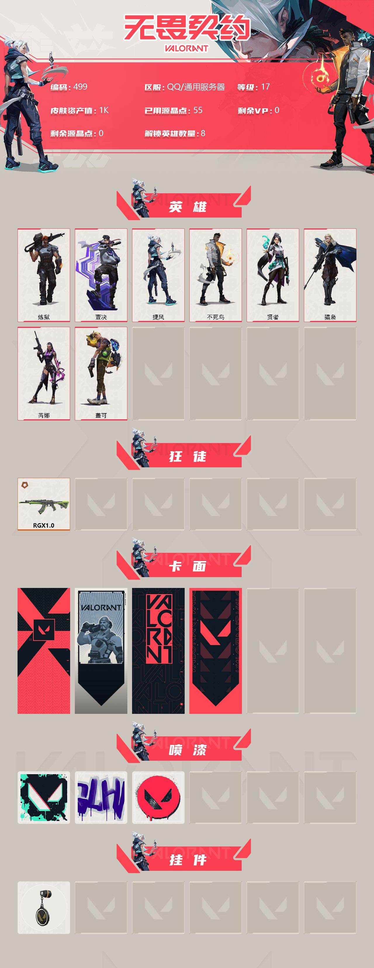 [12958243]【英雄】:炼狱,壹决,捷风,不死鸟,贤者,猎枭,芮娜,盖可 【狂徒】:狂徒-RGX 11z Pro 【卡面】:代号红色 卡面,新兵报到 卡面,V契约 卡面,无畏契约 卡面 【喷漆】:胜利属于无畏契约 喷漆,GLHF 喷漆,无畏契约 喷漆 【挂饰】:无畏契约 纪念币 挂饰