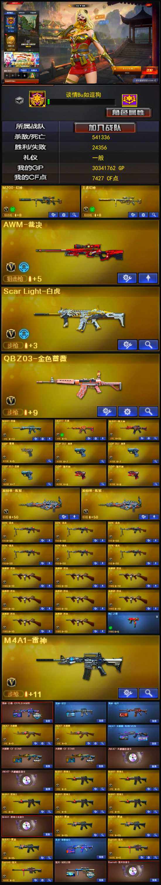 【热门武器】:QBZ03-金色蔷薇,Scar Light-白虎,HK417-朱雀,M200-幻神,死亡之眼,王者炎心,C.A.T,M4A1-黑骑士*5,汤姆逊-烈龙*8,RPK-盘龙*6,加特林-炼狱*2,COP-白鲨,USP-雷暴,COP-堕天神*2,沙鹰-修罗*3