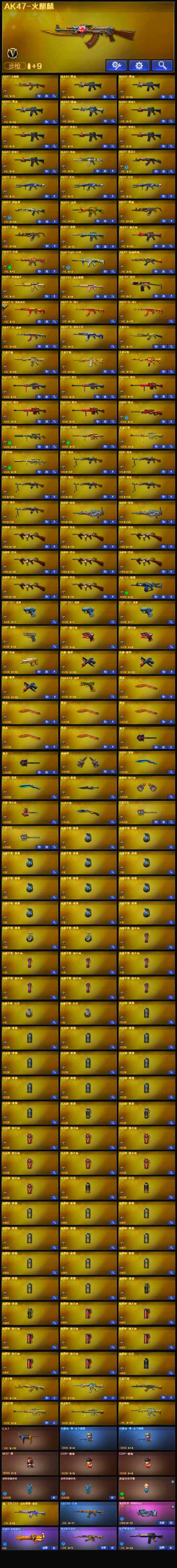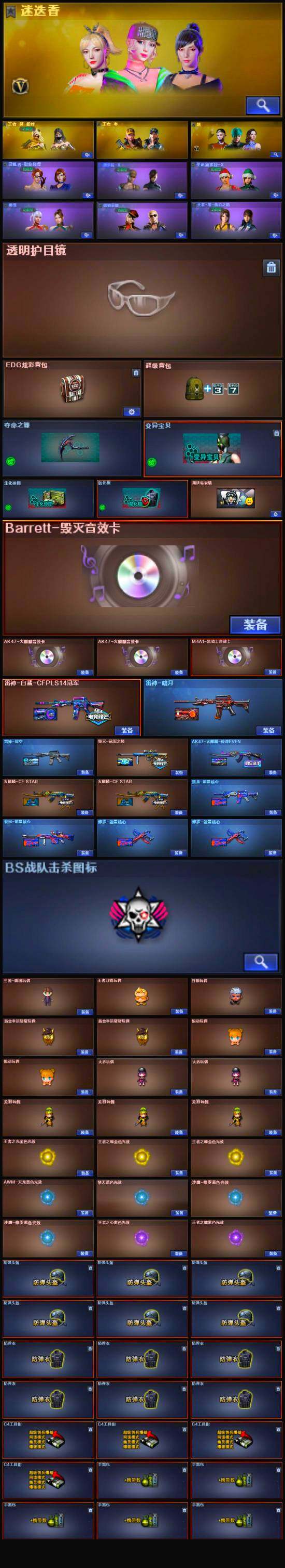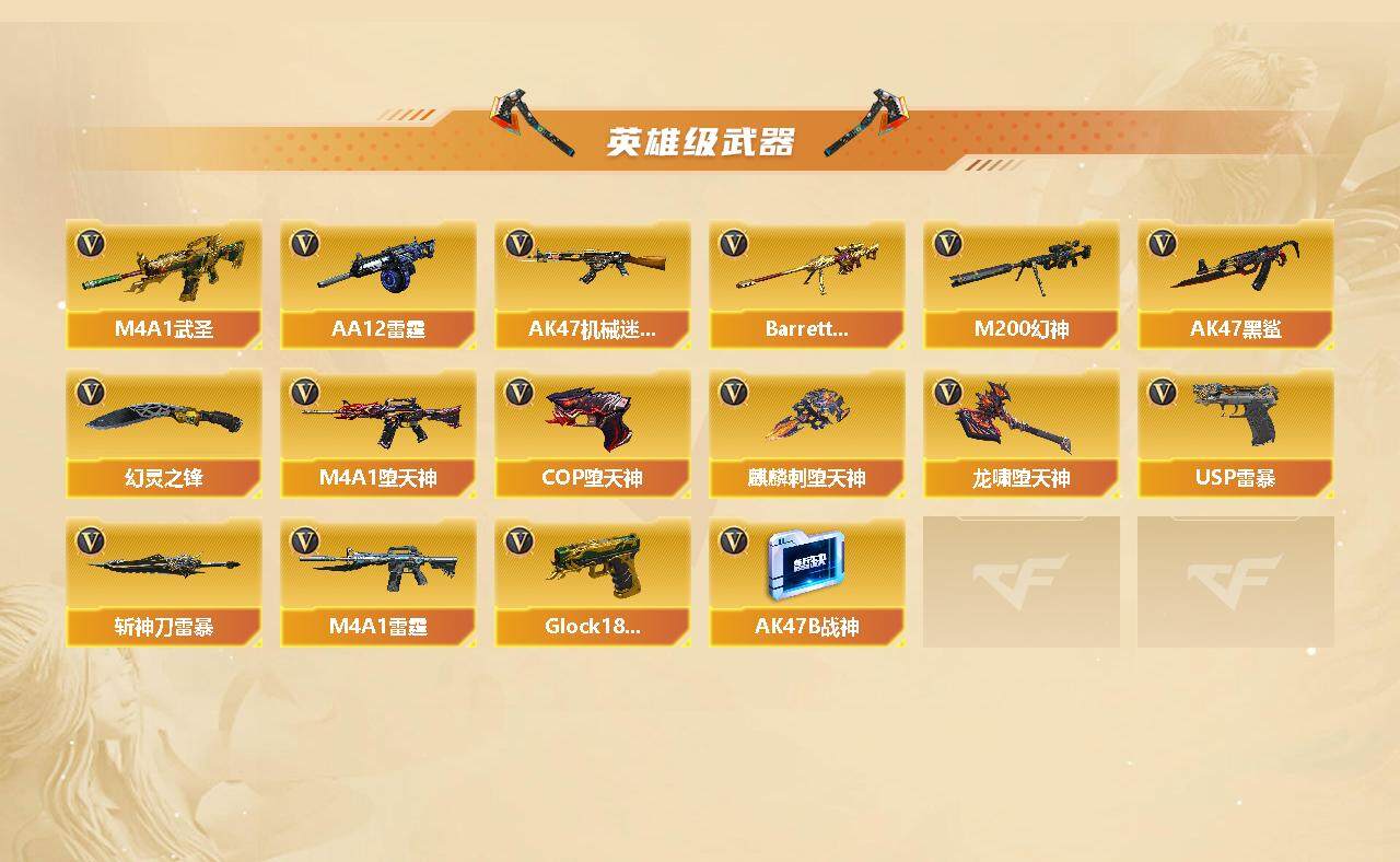 【英雄级武器】:幻灵之锋,M4A1-堕天神,COP-堕天神*2,麒麟刺-堕天神,龙啸-堕天神,USP-雷暴,斩神刀-雷暴,M4A1-雷霆,M4A1-武圣,Glock18-武圣,QBZ03-金色蔷薇,Scar Light-白虎,HK417-朱雀,M4A1-雷神,M4A1-黑龙*3,M4A1-玫瑰精灵,M4A1-黑骑士*5,M4A1-死神,RPK-盘龙*6,加特林-炼狱*2,汤姆逊-烈龙*8,AK47-火麒麟*2,AK47-黑武士,AK12-天启*3,AN94-超新星,Barrett-毁灭*2,Barrett-极光*3,AWM-裁决,AK47-机械迷城,AA-12-雷霆,Barrett-朱雀,M200-幻神,AK47-黑鲨*2,AK47-B-战神,AK47-B-常胜将军,沙鹰-天神,沙鹰-修罗*3,麒麟刺,擎天*2,屠龙*6