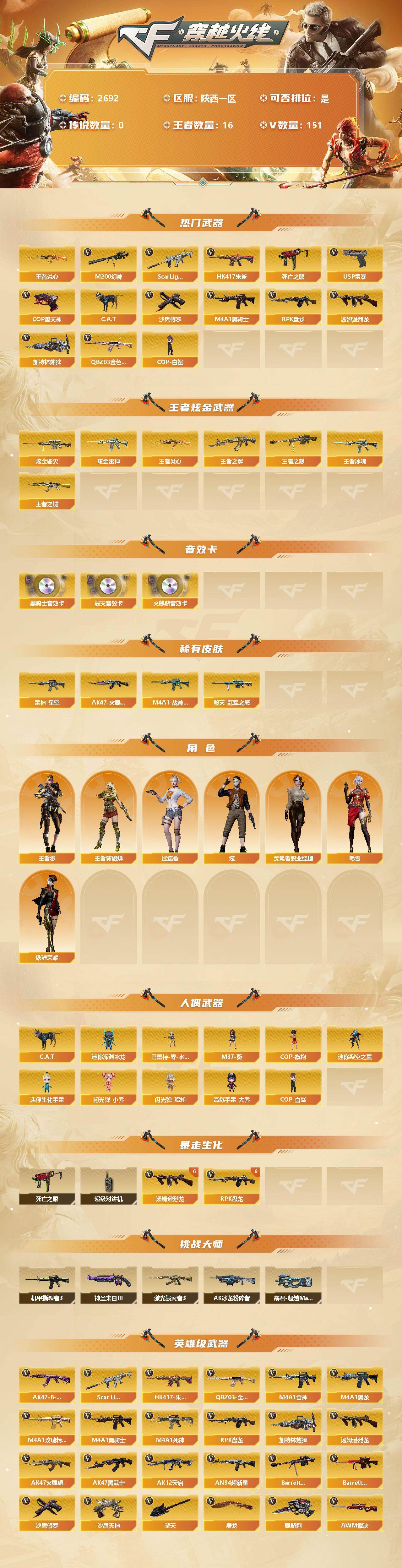 [12958455]陕西一区-151V-16王者-2炫金 【热门武器】:QBZ03-金色蔷薇,Scar Light-白虎,HK417-朱雀,M200-幻神,死亡之眼,王者炎心,C.A.T,M4A1-黑骑士*5,汤姆逊-烈龙*8,RPK-盘龙*6,加特林-炼狱*2,COP-白鲨,USP-雷暴,COP-堕天神*2,沙鹰-修罗*3 【王者炫金武器】:炫金毁灭,炫金雷神,王者之城,王者冰魄,王者炎心,王者之翼,王者之怒 【音效卡】:AK47-火麒麟音效卡*2,M4A1-黑骑士音效卡,Barrett-毁灭音效卡 【稀有皮肤】:雷神-星空,M4A1-战神赵云,AK47-火麒麟-传奇EVEN,毁灭-冠军之怒 【角色】:王者-葵-貂蝉,王者-零,灵狐者-职业经理,炫,迷迭香,蜀雪,铁骑荣耀 【人偶武器】:COP-白鲨,巴雷特-零-水下丽影*2,M37-葵,COP-旗袍*2,C.A.T,迷你深渊冰龙*2,迷你裂空之翼*5,迷你生化手雷,闪光弹-小乔,闪光弹-貂蝉,高爆手雷-大乔 【暴走生化】:死亡之眼,超级对讲机 【挑战大师】:机甲撕裂者III,神圣爆裂者-末日III,激光毁灭者III,AK47-冰龙粉碎者,暴君乱世-超越Max 【英雄级武器】:幻灵之锋,M4A1-堕天神,COP-堕天神*2,麒麟刺-堕天神,龙啸-堕天神,USP-雷暴,斩神刀-雷暴,M4A1-雷霆,M4A1-武圣,Glock18-武圣,QBZ03-金色蔷薇,Scar Light-白虎,HK417-朱雀,M4A1-雷神,M4A1-黑龙*3,M4A1-玫瑰精灵,M4A1-黑骑士*5,M4A1-死神,RPK-盘龙*6,加特林-炼狱*2,汤姆逊-烈龙*8,AK47-火麒麟*2,AK47-黑武士,AK12-天启*3,AN94-超新星,Barrett-毁灭*2,Barrett-极光*3,AWM-裁决,AK47-机械迷城,AA-12-雷霆,Barrett-朱雀,M200-幻神,AK47-黑鲨*2,AK47-B-战神,AK47-B-常胜将军,沙鹰-天神,沙鹰-修罗*3,麒麟刺,擎天*2,屠龙*6 【特殊枪械】:1白虎,5黑骑士,6烈龙,6盘龙,2炼狱