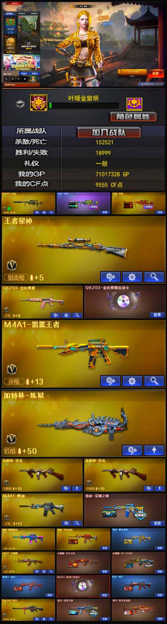 - [12308744]【商品标题】:北方大区-104V-13王者-2炫金 【热门武器】:QBZ03-金色蔷薇,M200-幻神,死亡之眼*2,C.A.T,M4A1-黑骑士,汤姆逊-烈龙*7,RPK-盘龙*6,加特林-炼狱*5,斯泰尔-蝴蝶,USP-雷暴,沙鹰-修罗*4 【王者炫金武器】:炫金毁灭,炫金超新星,王者之城,王者之幻,王者之刺 【音效卡】:AK47-火麒麟音效卡,M4A1-雷神音效卡,M4A1-黑骑士音效卡,Barrett-毁灭音效卡 【稀有皮肤】:雷神-星空,火麒麟-轻羽皮肤,黑骑士-暗月*3,毁灭-暗月,毁灭耀金皮肤,天龙-秘银,天龙-能量核心 【角色】:王者春,王者玲珑,零,春,铁骑荣耀 【人偶武器】:斯泰尔-蝴蝶,火麒麟-灵狐,巴雷特-零-水下丽影,COP-旗袍,C.A.T,夺魂,迷你生化手雷,闪光弹-小乔 【暴走生化】:斯泰尔-蝴蝶,死亡之眼*2 【挑战大师】:神圣爆裂者III 【英雄级武器】:柯尔特-竞技荣光*2,高爆手雷-竞技荣光,烟雾弹-竞技荣光,闪光弹-竞技荣光*2,马来剑-夜魔,麒麟刺-堕天神*2,龙啸-堕天神,AK47-雷暴,USP-雷暴,斩神刀-雷暴,QBZ03-金色蔷薇,M4A1-雷神*2,M4A1-黑龙*4,M4A1-玫瑰精灵,M4A1-黑骑士,M4A1-死神,RPK-盘龙*6,加特林-炼狱*5,汤姆逊-烈龙*7,AK47-火麒麟*2,AK47-黑武士,AN94-超新星,AWM-天龙,Barrett-毁灭,Barrett-极光*2,AWM-裁决,AK47-机械迷城,M200-幻神,AK47-黑鲨,AK-47-猩红传说,AK47-B-战神,沙鹰-天神*2,沙鹰-修罗*4,麒麟刺*2,擎天,龙啸,屠龙*2 【特殊枪械】:蝴蝶斯泰尔+6烈龙,1黑骑士,6烈龙,6盘龙,5炼狱,1蝴蝶斯泰尔
