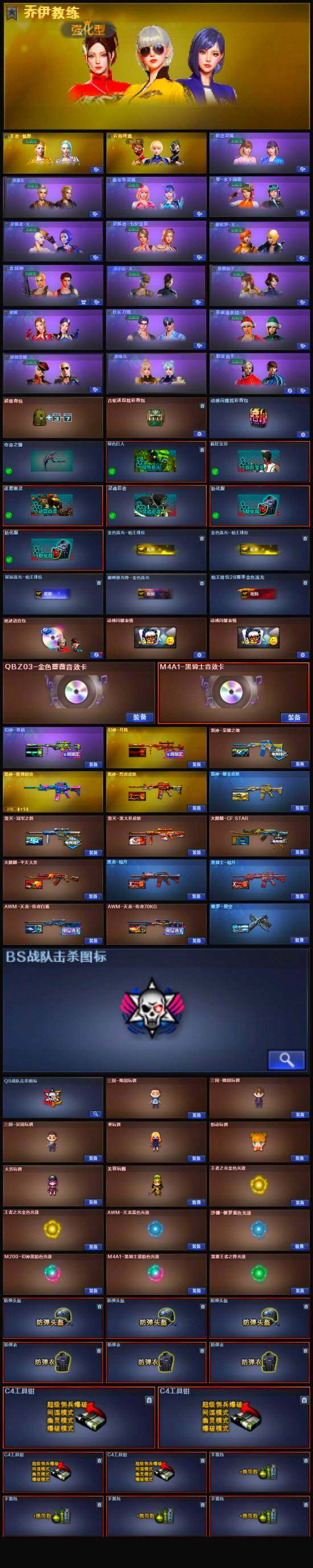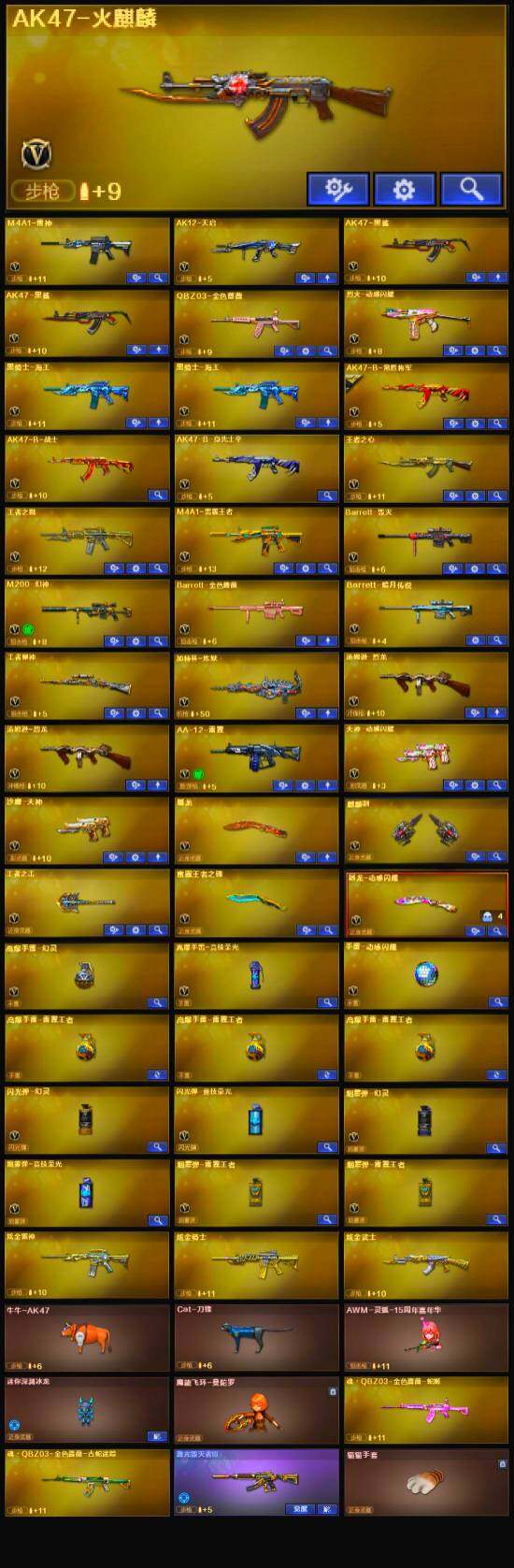 【英雄级武器】:高爆手雷-竞技荣光,烟雾弹-竞技荣光,闪光弹-竞技荣光,烈火-动感闪耀,天神-动感闪耀,屠龙-动感闪耀,手雷-动感闪耀,QBZ03-金色蔷薇,M4A1-雷神,加特林-炼狱,汤姆逊-烈龙*2,AK47-火麒麟,AK12-天启,Barrett-毁灭,AA-12-雷霆,M200-幻神,AK47-黑鲨*2,黑骑士-海王*2,AK-47-猩红传说,AK47-B-常胜将军,M4A1-赤狱骑士,沙鹰-天神,麒麟刺,屠龙