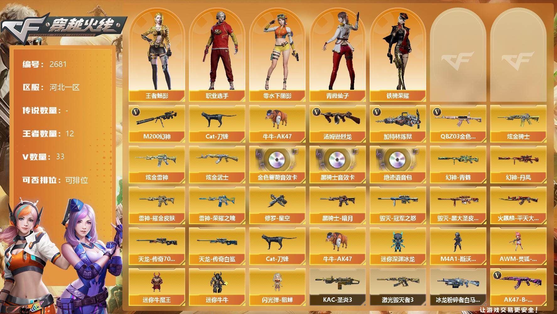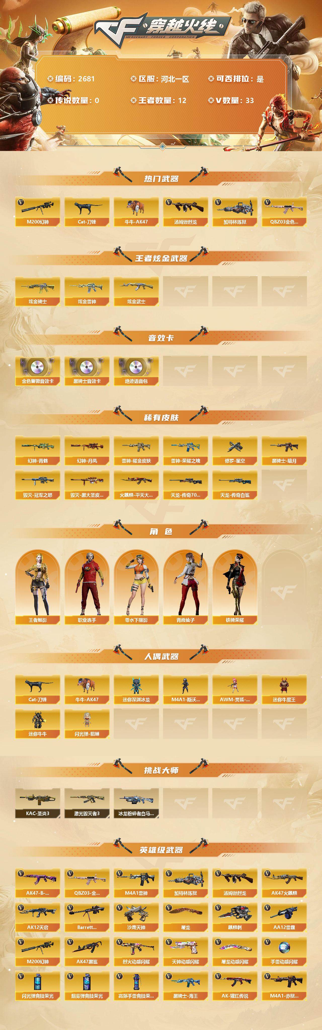 [12958366]河北一区-33V-12王者-3炫金 【热门武器】:QBZ03-金色蔷薇,M200-幻神,Cat-刀锋,牛牛-AK47,汤姆逊-烈龙*2,加特林-炼狱 【王者炫金武器】:炫金骑士,炫金雷神,炫金武士 【音效卡】:M4A1-黑骑士音效卡,QBZ03-金色蔷薇音效卡,绝迹语音包 【稀有皮肤】:幻神-丹凤,幻神-青鹤,雷神-荣耀之魄,雷神-耀金皮肤,火麒麟-平天大圣,黑骑士-暗月,毁灭-冠军之怒,毁灭-黑大圣皮肤,AWM-天龙-传奇70KG,AWM-天龙-传奇白鲨,修罗-星空 【角色】:王者-魅影,零-水下丽影,铁骑荣耀,职业选手,青霞仙子 【人偶武器】:M4A1-斯沃特,AWM-灵狐-15周年嘉年华,Cat-刀锋,牛牛-AK47,迷你深渊冰龙,迷你牛魔王,迷你牛牛,闪光弹-貂蝉 【挑战大师】:KAC-圣炎切割者III,激光毁灭者III,冰龙粉碎者-白马银枪 【英雄级武器】:高爆手雷-竞技荣光,烟雾弹-竞技荣光,闪光弹-竞技荣光,烈火-动感闪耀,天神-动感闪耀,屠龙-动感闪耀,手雷-动感闪耀,QBZ03-金色蔷薇,M4A1-雷神,加特林-炼狱,汤姆逊-烈龙*2,AK47-火麒麟,AK12-天启,Barrett-毁灭,AA-12-雷霆,M200-幻神,AK47-黑鲨*2,黑骑士-海王*2,AK-47-猩红传说,AK47-B-常胜将军,M4A1-赤狱骑士,沙鹰-天神,麒麟刺,屠龙 【特殊枪械】:2烈龙,1炼狱