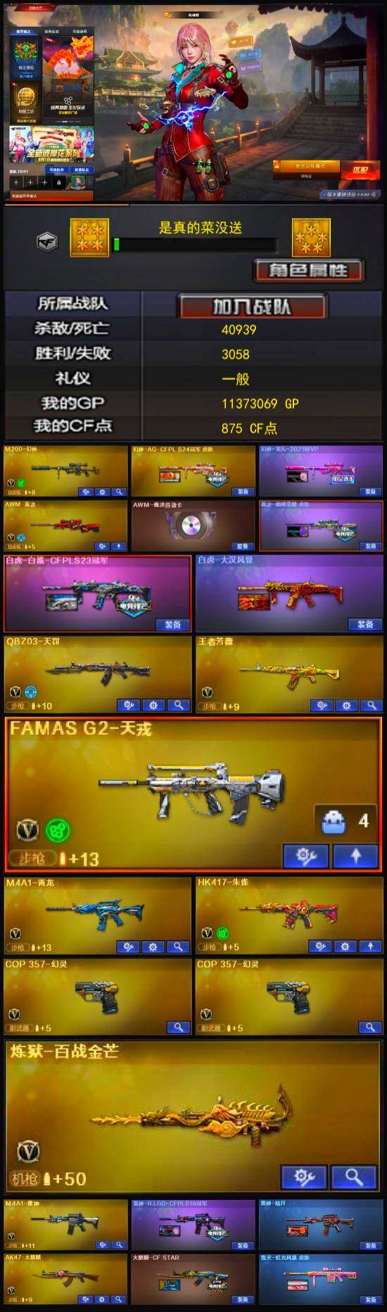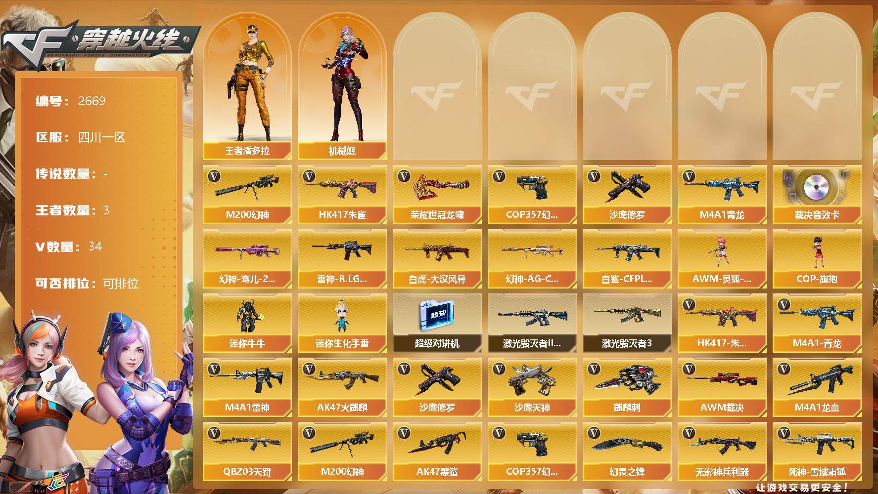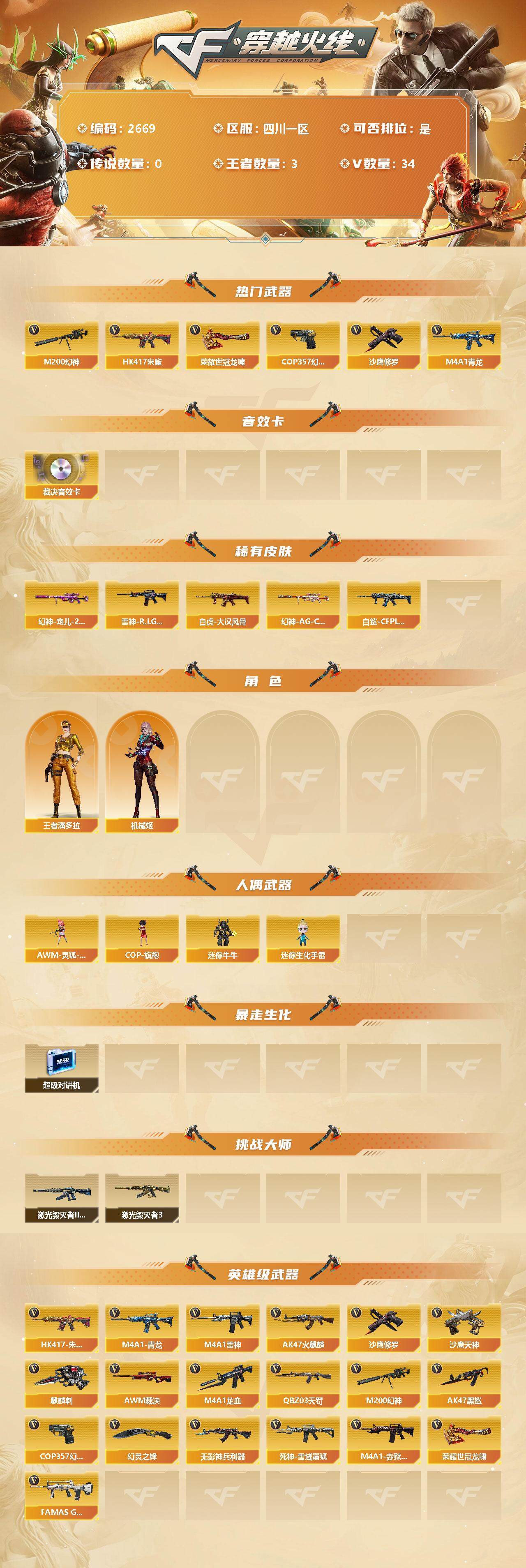 [12958313]四川一区-34V-3王者-0炫金 【热门武器】:HK417-朱雀,M4A1-青龙,M200-幻神,COP 357-幻灵*2,沙鹰-修罗,荣耀世冠-龙啸 【音效卡】:AWM-裁决音效卡 【稀有皮肤】:幻神-宠儿-2021MVP,幻神-AG-CFPL S24冠军 皮肤,白虎-大汉风骨,白虎-白鲨-CFPLS23冠军,雷神-R.LGD-CFPLS18冠军 【角色】:王者潘多拉,机械姬 【人偶武器】:AWM-灵狐-15周年嘉年华,COP-旗袍,迷你牛牛,迷你生化手雷 【暴走生化】:超级对讲机 【挑战大师】:激光毁灭者III,激光毁灭者III-白马银枪 【英雄级武器】:COP 357-幻灵*2,幻灵之锋,荣耀世冠-龙啸,FAMAS G2-天戎,HK417-朱雀,M4A1-青龙,无影-神兵利器,M4A1-雷神,AK47-火麒麟,AWM-裁决,M4A1-龙血,QBZ03-天罚,M200-幻神,AK47-黑鲨,死神-雪域霜狐,M4A1-赤狱骑士,沙鹰-天神,沙鹰-修罗,麒麟刺*2 【特殊枪械】: