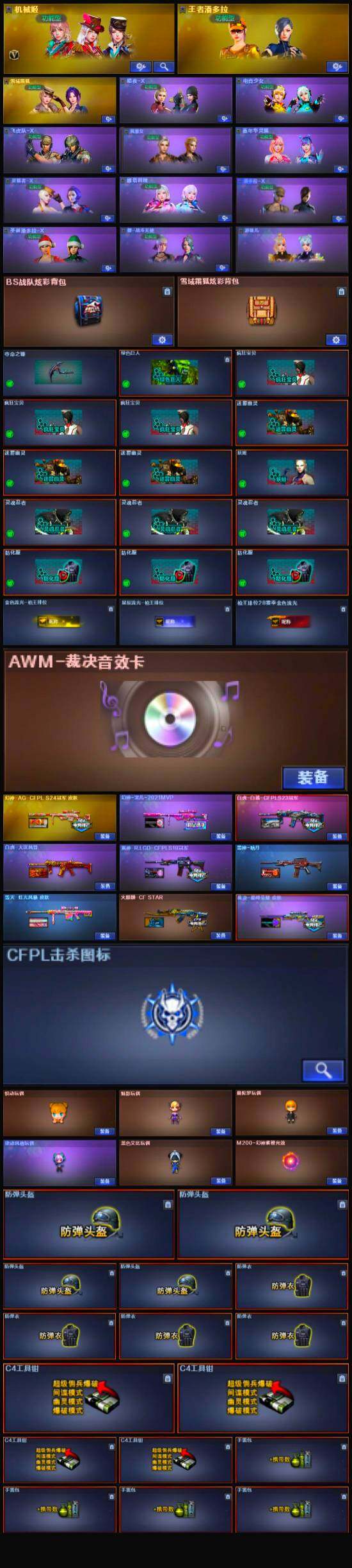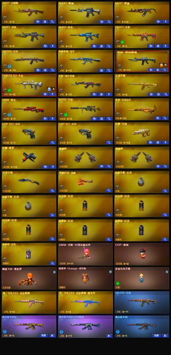 【英雄级武器】:COP 357-幻灵*2,幻灵之锋,荣耀世冠-龙啸,FAMAS G2-天戎,HK417-朱雀,M4A1-青龙,无影-神兵利器,M4A1-雷神,AK47-火麒麟,AWM-裁决,M4A1-龙血,QBZ03-天罚,M200-幻神,AK47-黑鲨,死神-雪域霜狐,M4A1-赤狱骑士,沙鹰-天神,沙鹰-修罗,麒麟刺*2