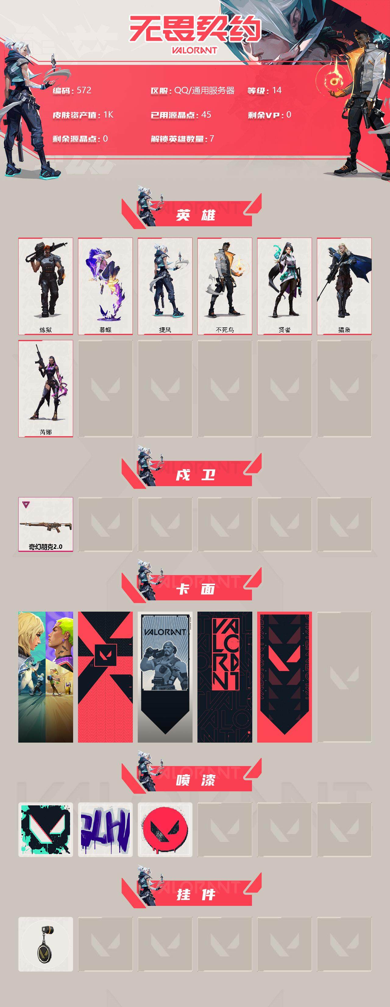 [12958781]【英雄】:炼狱,暮蝶,捷风,不死鸟,贤者,猎枭,芮娜 【戍卫】:戍卫-奇幻朋克//2.0 【卡面】:钢锁vs盖可 卡面,代号红色 卡面,新兵报到 卡面,V契约 卡面,无畏契约 卡面 【喷漆】:胜利属于无畏契约 喷漆,GLHF 喷漆,无畏契约 喷漆 【挂饰】:无畏契约 纪念币 挂饰