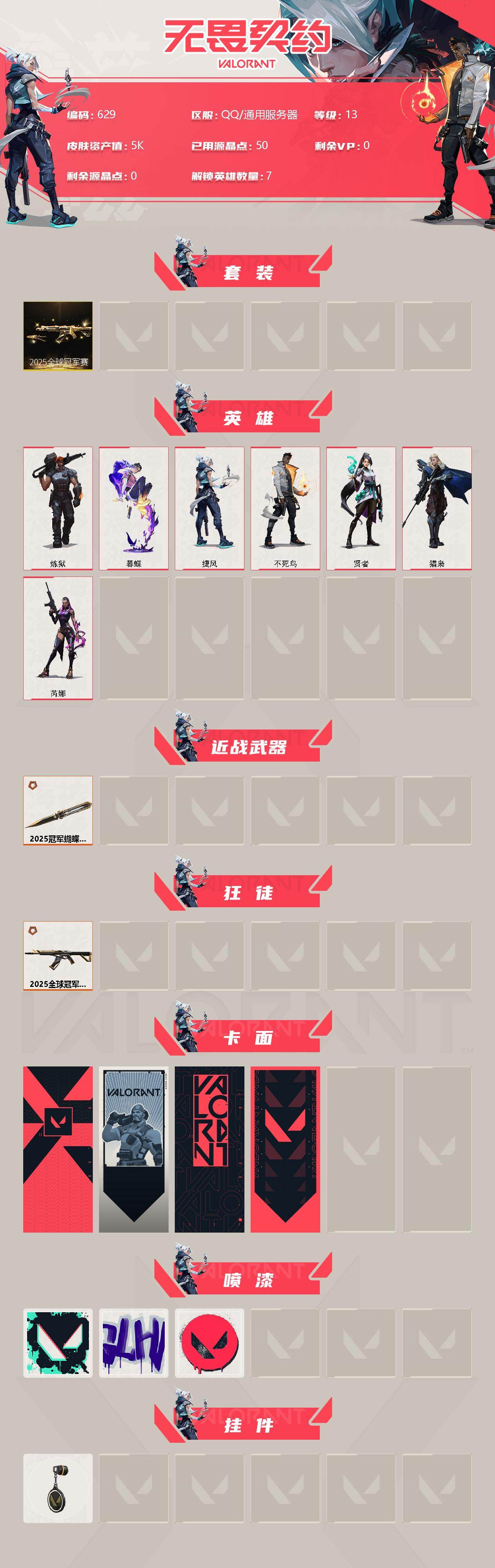 [12959128]【套装】:2025全球冠军赛套装 【英雄】:炼狱,暮蝶,捷风,不死鸟,贤者,猎枭,芮娜 【近战 武器】:近战武器-2025全球冠军赛 蝴蝶刀 【狂徒】:狂徒-2025全球冠军赛 【卡面】:代号红色 卡面,新兵报到 卡面,V契约 卡面,无畏契约 卡面 【喷漆】:胜利属于无畏契约 喷漆,GLHF 喷漆,无畏契约 喷漆 【挂饰】:无畏契约 纪念币 挂饰