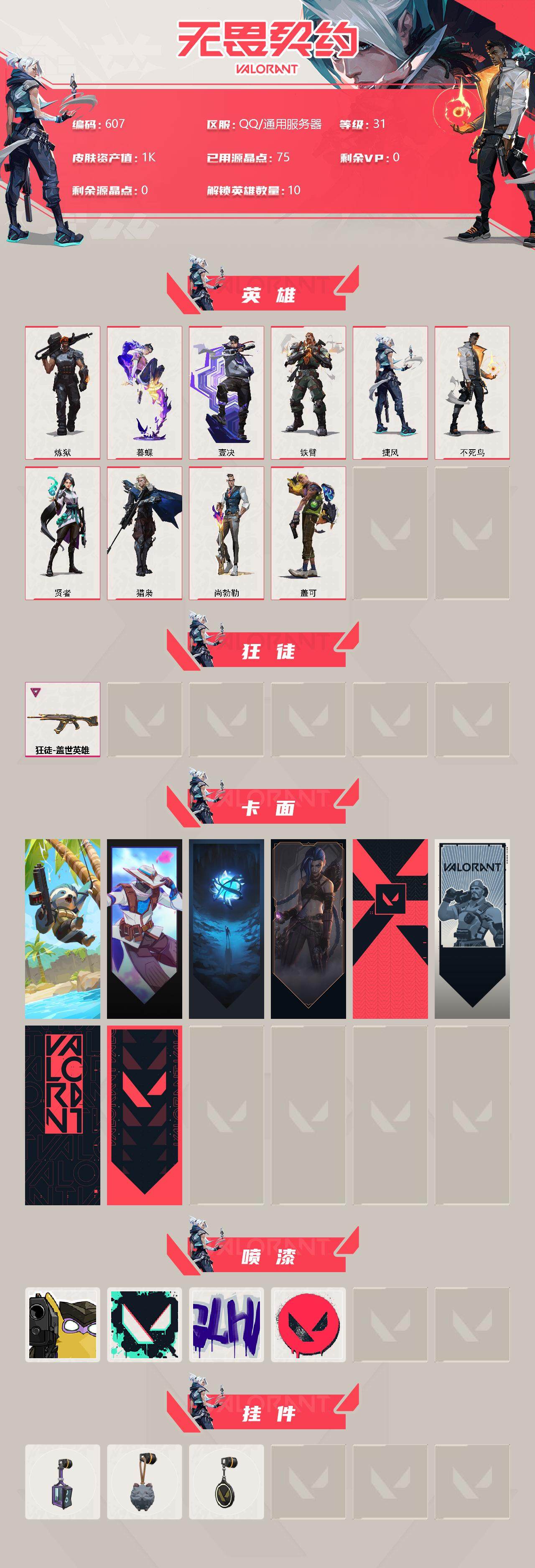 [12958951]【英雄】:炼狱,暮蝶,壹决,铁臂,捷风,不死鸟,贤者,猎枭,尚勃勒,盖可 【狂徒】:狂徒-盖世英雄 【卡面】:树懒大作战 卡面,无畏契约GO!第一卷:零 卡面,无垠星环 卡面,《双城之战》金克丝 卡面,代号红色 卡面,新兵报到 卡面,V契约 卡面,无畏契约 卡面 【喷漆】:放下武器 喷漆,胜利属于无畏契约 喷漆,GLHF 喷漆,无畏契约 喷漆 【挂饰】:动力机箱 挂饰,《双城之战》魄罗 挂饰,无畏契约 纪念币 挂饰