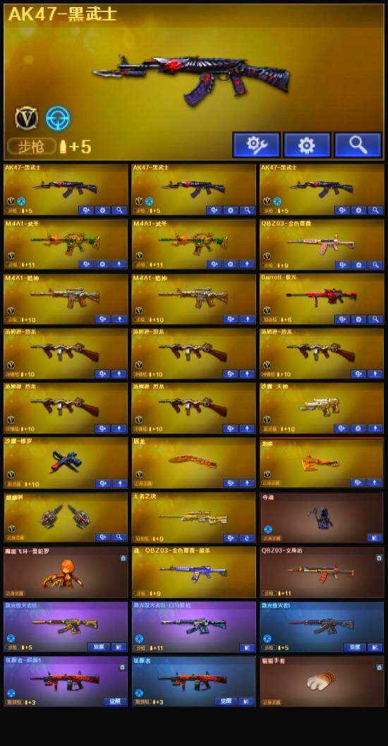 【英雄级武器】:M4A1-武圣*2,QBZ03-金色蔷薇,汤姆逊-烈龙*5,AK47-黑武士*4,Barrett-极光,M4A1-猎神*2,沙鹰-天神,沙鹰-修罗,麒麟刺,龙啸,屠龙