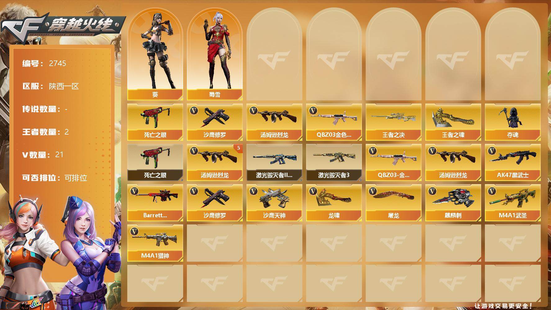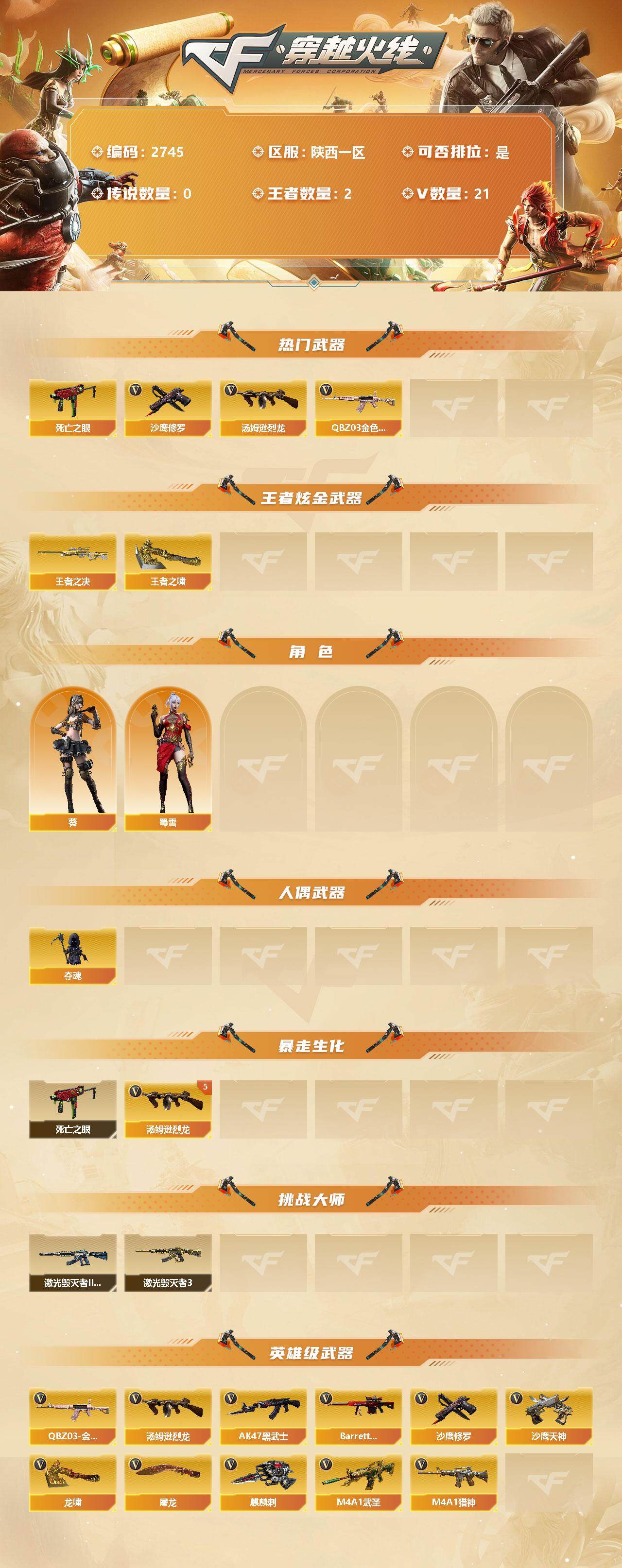 [12959091]陕西一区-21V-2王者-0炫金 【热门武器】:QBZ03-金色蔷薇,死亡之眼,汤姆逊-烈龙*5,沙鹰-修罗 【王者炫金武器】:王者之决,王者之啸 【角色】:葵,蜀雪 【人偶武器】:夺魂 【暴走生化】:死亡之眼 【挑战大师】:激光毁灭者III,激光毁灭者III-白马银枪 【英雄级武器】:M4A1-武圣*2,QBZ03-金色蔷薇,汤姆逊-烈龙*5,AK47-黑武士*4,Barrett-极光,M4A1-猎神*2,沙鹰-天神,沙鹰-修罗,麒麟刺,龙啸,屠龙 【特殊枪械】:5烈龙