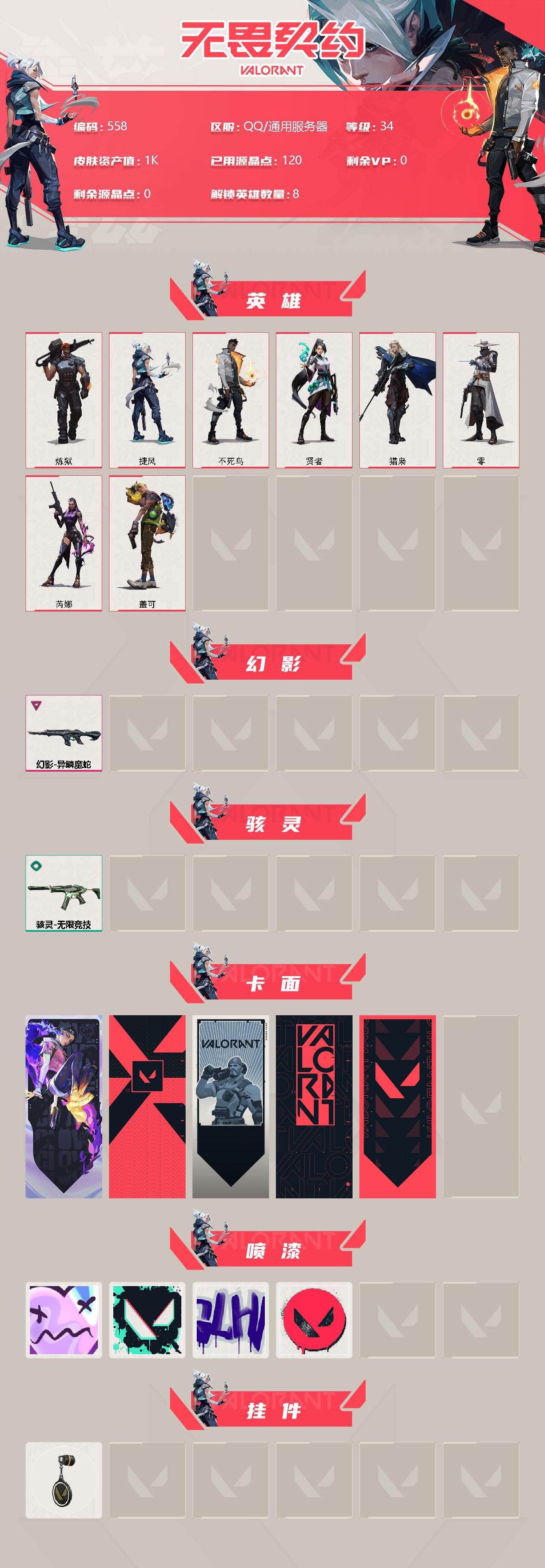 [12958705]【英雄】:炼狱,捷风,不死鸟,贤者,猎枭,零,芮娜,盖可 【幻影】:幻影-异鳞魔蛇 【骇灵】:骇灵-无限竞技 【卡面】:无畏契约:暮蝶 卡面,代号红色 卡面,新兵报到 卡面,V契约 卡面,无畏契约 卡面 【喷漆】:伤心心 喷漆,胜利属于无畏契约 喷漆,GLHF 喷漆,无畏契约 喷漆 【挂饰】:无畏契约 纪念币 挂饰