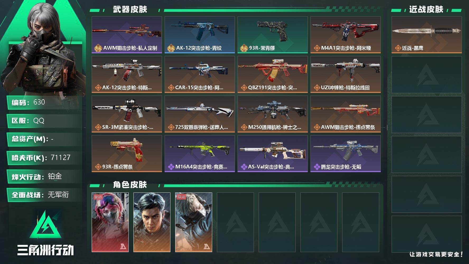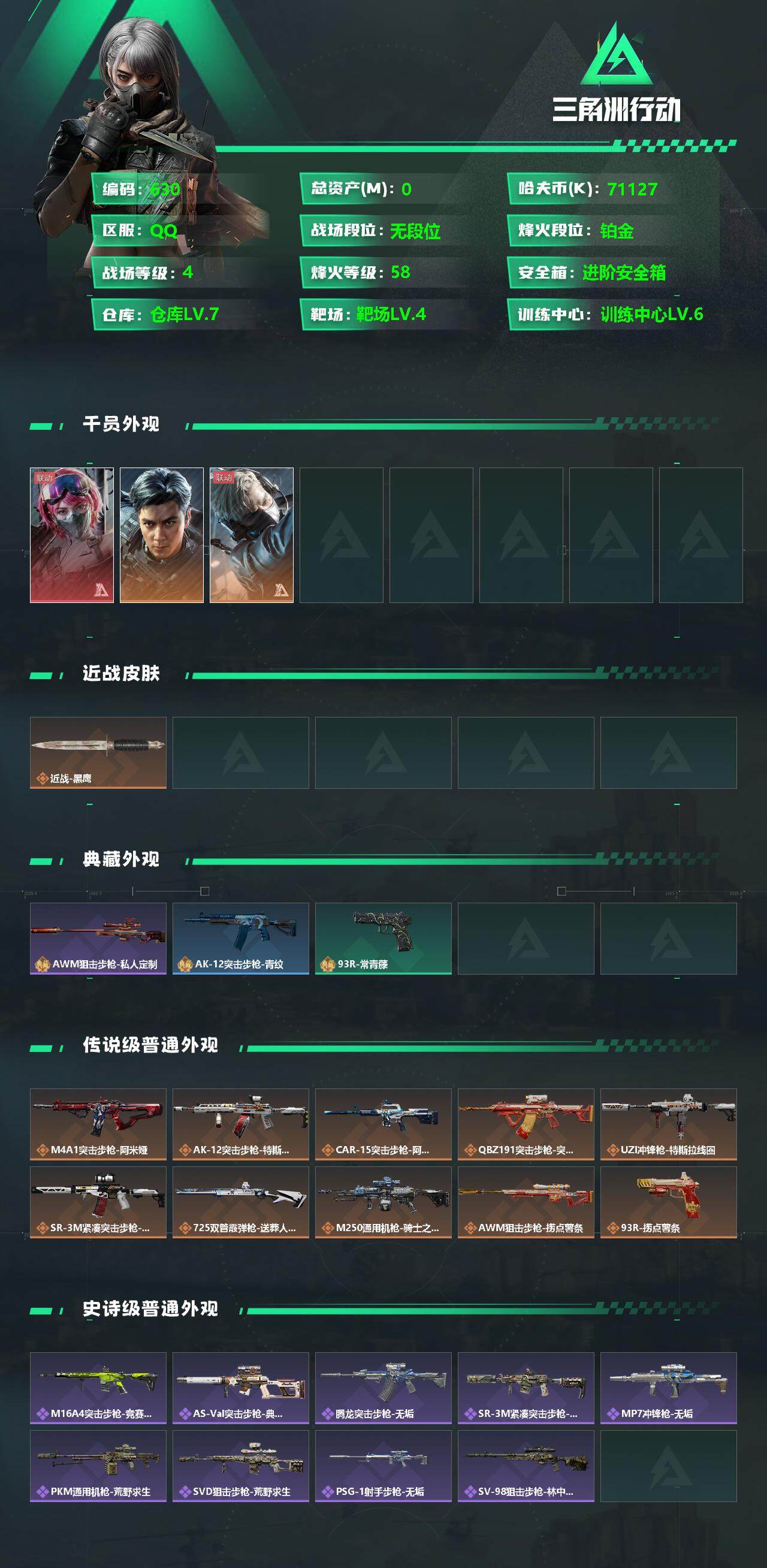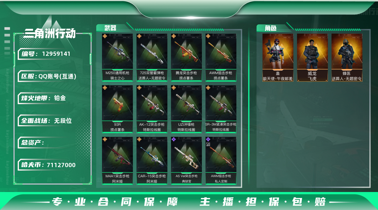 [12959141]71127k哈伏币-105m流动资产-58烽火等级-铂金-4战场等级-无军衔 【干员外观】:蛊-能天使午夜邮差,威龙-飞虎,蜂医-送葬人·无题密令 【近战皮肤】:近战-黑鹰 【典藏外观】:AWM狙击步枪-私人定制,AK-12突击步枪-青纹,93R-常青藤 【传说级普通外观】:M4A1突击步枪-阿米娅,AK-12突击步枪-特斯拉线圈,CAR-15突击步枪-阿米娅,腾龙突击步枪-捞点薯条,UZI冲锋枪-特斯拉线圈,SR-3M紧凑突击步枪-特斯拉线圈,725双管霰弹枪-送葬人-无题密令,M250通用机枪-骑士之心,AWM狙击步枪-捞点薯条,93R-捞点薯条 【史诗级普通外观】:M16A4突击步枪-竞赛选手,AS Val突击步枪-典狱官,腾龙突击步枪-无垢,SR-3M紧凑突击步枪-荒野求生,MP7冲锋枪-无垢,PKM通用机枪-荒野求生,SVD狙击步枪-荒野求生,PSG-1射手步枪-无垢,SV-98狙击步枪-林中猎手 【稀有级普通外观】:K416突击步枪-虎啸,腾龙突击步枪-雪崩,K437突击步枪-天狼星,MP5冲锋枪-虎啸,SMG-45-行动开启,SR-3M紧凑突击步枪-雪崩,M249轻机枪-毛鲁斯之力,M250通用机枪-虎啸,SKS射手步枪-雪崩,SR-9射手步枪-街头涂鸦,SV-98狙击步枪-星链科技 【普通级普通外观】:M4A1突击步枪-海色,AKM突击步枪-彩墨喷涂,QBZ95-1突击步枪-海浪,M16A4突击步枪-山林猎人,AUG突击步枪-浅蓝涂装,M7战斗步枪-红色涂装,SG552突击步枪-浅蓝涂装,SG552突击步枪-彩墨喷涂,G3战斗步枪-高雅黑,G3战斗步枪-山林猎人,腾龙突击步枪-彩墨喷涂,UZI冲锋枪-海色,UZI冲锋枪-山林猎人,野牛冲锋枪-彩墨喷涂,PKM通用机枪-彩墨喷涂,QJB201轻机枪-山林猎人,Mini-14射手步枪-山林猎人,SR-25射手步枪-黄蜂,M700狙击步枪-山林猎人,沙漠之鹰-海浪 【军牌】:军牌-飞驰,军牌-捞点薯条,军牌-特斯拉线圈,军牌-失重,军牌-送葬人·无题密令,军牌-修整,军牌-信誉优秀,军牌-下午茶 【挂饰】:挂饰-特斯拉线圈,挂饰-来点薯条,挂饰-晶石回响,挂饰-阿萨拉狙击兵,挂饰-阿萨拉霰弹兵,挂饰-阿萨拉徽章