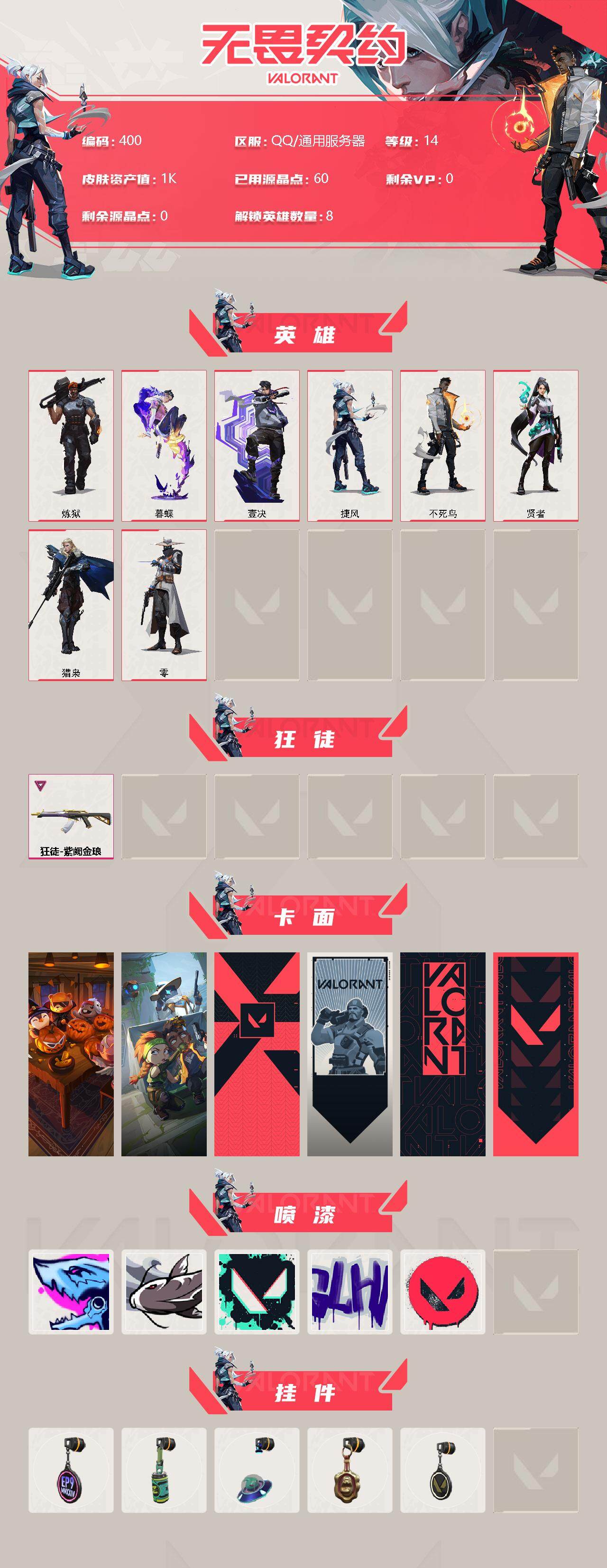 [12957657]【英雄】:炼狱,暮蝶,壹决,捷风,不死鸟,贤者,猎枭,零 【狂徒】:狂徒-紫阙金琅 【卡面】:南瓜盛典 卡面,别冒尖 卡面,代号红色 卡面,新兵报到 卡面,V契约 卡面,无畏契约 卡面 【喷漆】:暴走萝莉 喷漆,松叶 喷漆,胜利属于无畏契约 喷漆,GLHF 喷漆,无畏契约 喷漆 【挂饰】:第九季//第三幕 纪念币 挂饰,Z世代特饮 挂饰,天外飞客 挂饰,海豹的认可 挂饰,无畏契约 纪念币 挂饰