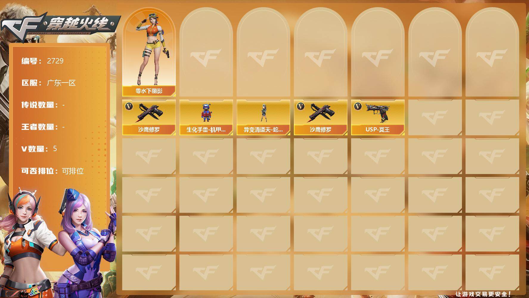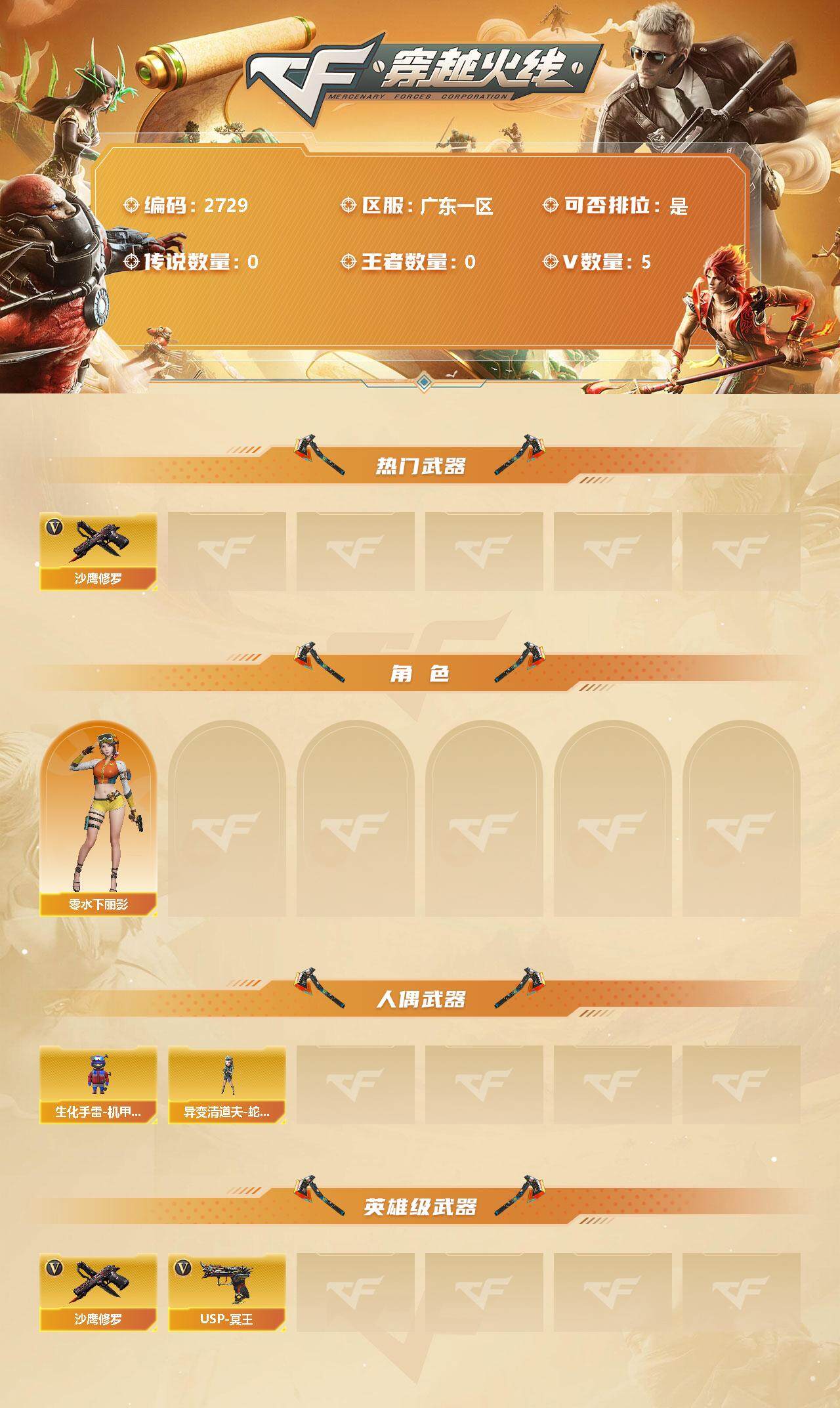 [12959006]广东一区-5V-0王者-0炫金 【热门武器】:沙鹰-修罗*2 【角色】:零-水下丽影 【人偶武器】:异变清道夫-蛇影双骄,生化手雷-机甲核心 【英雄级武器】:USP-冥王,沙鹰-修罗*2 【特殊枪械】:
