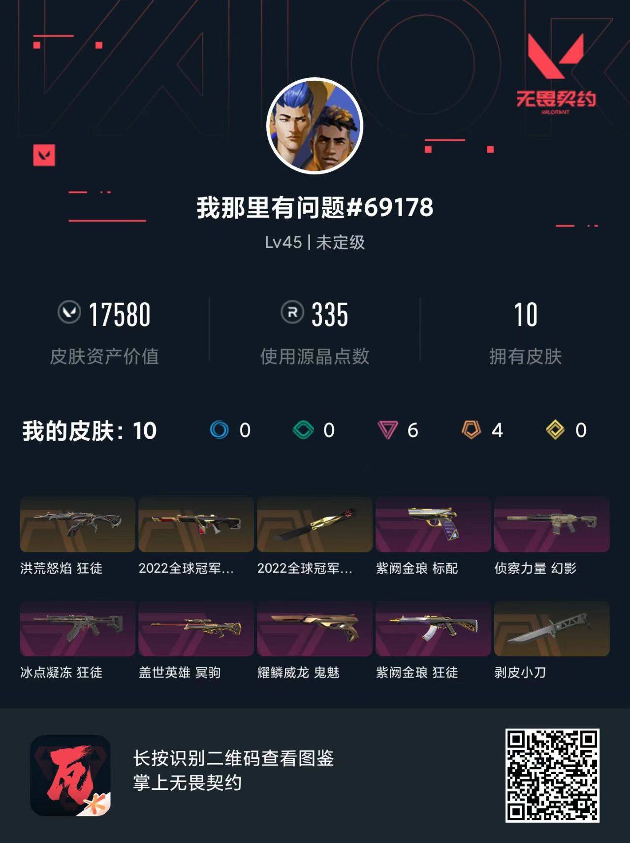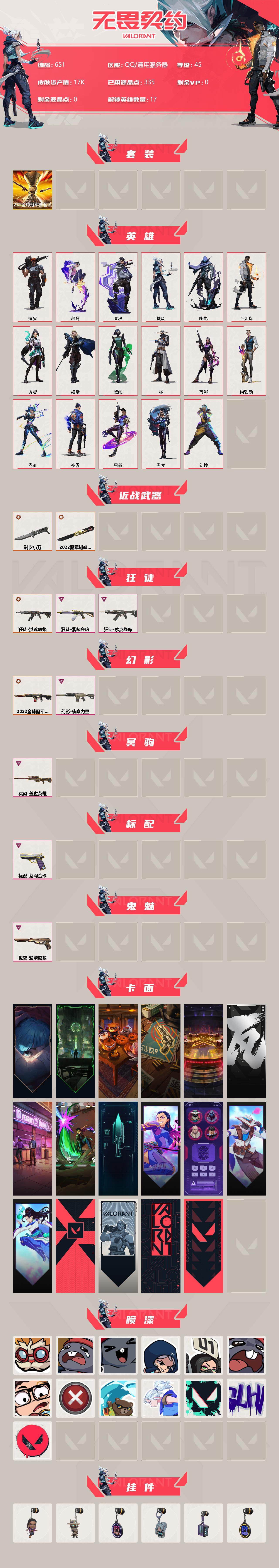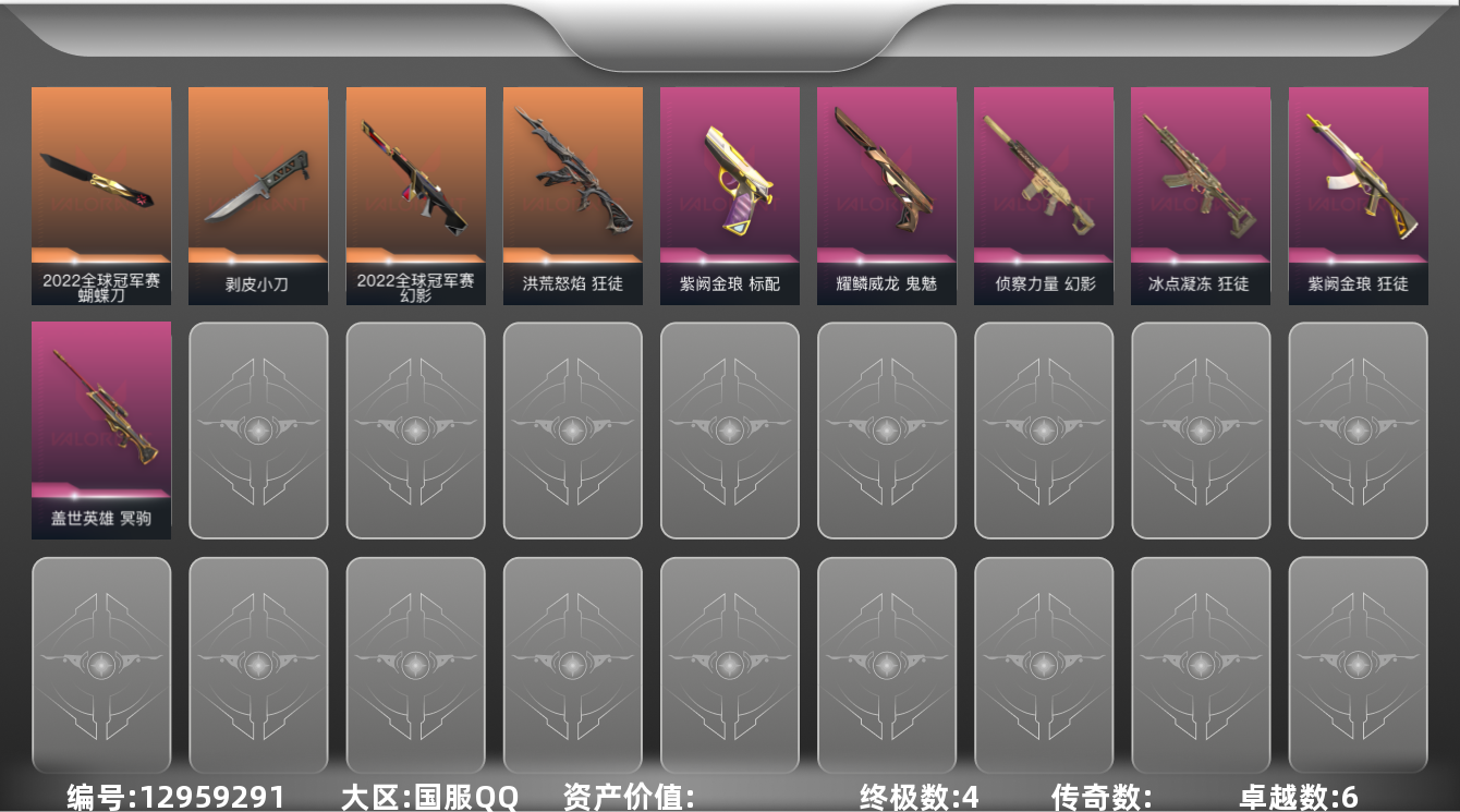 [12959291]【套装】:2022全球冠军赛套装 【英雄】:幻棱,炼狱,暮蝶,壹决,捷风,幽影,不死鸟,贤者,猎枭,蝰蛇,零,芮娜,尚勃勒,霓虹,夜露,星礈,黑梦 【近战 武器】:近战武器-2022全球冠军赛 蝴蝶刀,近战武器-剥皮小刀 【狂徒】:狂徒-洪荒怒焰,狂徒-冰点凝冻,狂徒-紫阙金琅 【幻影】:幻影-2022全球冠军赛,幻影-侦察力量 【冥驹】:冥驹-盖世英雄 【标配】:标配-紫阙金琅 【鬼魅】:鬼魅-耀鳞威龙 【卡面】:《双城之战》拥抱 卡面,欢迎来到底城 卡面,南瓜盛典 卡面,正义的化身 卡面,最高舞台 卡面,先瓦为敬 - 银色 卡面,梦幻奶茶 卡面,源能反应 卡面,零点嗅探设计图 卡面,无畏契约GO!第一卷:芮娜 卡面,清除名单 卡面,无畏契约GO!第一卷:零 卡面,无畏契约GO!第一卷:贤者 卡面,代号红色 卡面,新兵报到 卡面,V契约 卡面,无畏契约 卡面 【喷漆】:都算到了 喷漆,熊抱 喷漆,超级粉丝 喷漆,捷风差距 喷漆,我觉得不行 喷漆,我的刀呢? 喷漆,新潮流 喷漆,买装还是存钱 喷漆,酷熊冲浪 喷漆,无畏契约GO!第一卷:捷风 喷漆,胜利属于无畏契约 喷漆,GLHF 喷漆,无畏契约 喷漆 【挂饰】:无畏契约GO!第一卷 芮娜 挂饰,无畏契约GO!第一卷 零 挂饰,第九季//第二幕 纪念币 挂饰,袖珍捷风 挂饰,动力机箱 挂饰,第九季//第一幕 纪念币 挂饰,第八季:白银 挂饰,荧光棒 挂饰,第八季//第三幕 纪念币 挂饰,第八季//第二幕 纪念币 挂饰 ,天外飞客 挂饰,无畏契约 纪念币 挂饰