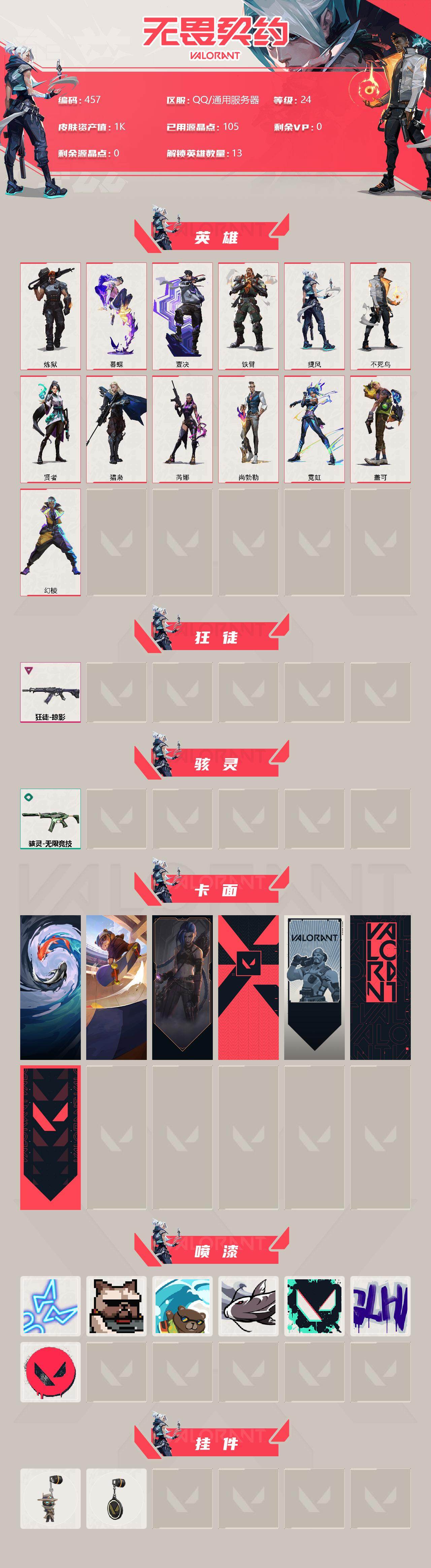 [12957997]【英雄】:幻棱,炼狱,暮蝶,壹决,铁臂,捷风,不死鸟,贤者,猎枭,芮娜,尚勃勒,霓虹,盖可 【狂徒】:狂徒-掠影 【骇灵】:骇灵-无限竞技 【卡面】:红鳞松叶 卡面,Clutch 卡面,《双城之战》金克丝 卡面,代号红色 卡面,新兵报到 卡面,V契约 卡面,无畏契约 卡面 【喷漆】:霓光四射 喷漆,关门放狗 喷漆,酷熊冲浪 喷漆,松叶 喷漆,胜利属于无畏契约 喷漆,GLHF 喷漆,无畏契约 喷漆 【挂饰】:无畏契约GO!第一卷 零 挂饰,无畏契约 纪念币 挂饰