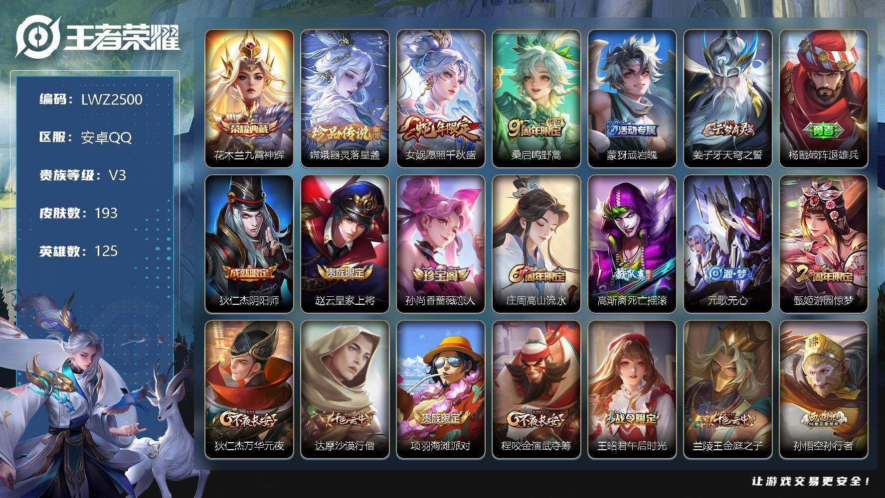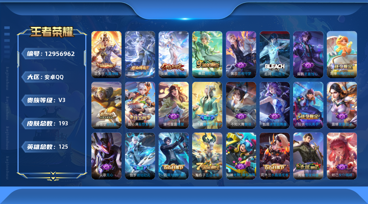 [12956962]中路37段/对抗路35段 安卓Q-V3-至尊星耀II段位-125英雄-193皮肤-1典藏-1珍品传说-2传说-53史诗 【荣耀典藏】:花木兰九霄神辉 【珍品传说】:嫦娥器灵落星盏 【传说皮肤】:女娲愿照千秋盛,桑启鸣野蒿 【限定皮肤】:蒙犽顽岩魄,姜子牙天穹之誓,杨戬破阵退雄兵,狄仁杰阴阳师,赵云皇家上将,孙尚香蔷薇恋人,庄周高山流水,高渐离死亡摇滚,元歌无心,甄姬游园惊梦,狄仁杰万华元夜,达摩沙漠行僧,项羽海滩派对,程咬金演武夺筹,王昭君午后时光,兰陵王金庭之子,孙悟空孙行者,李元芳云中旅人,钟馗驱傩正仪,雅典娜黎明之约,太乙真人华丽摇滚,鬼谷子五谷丰年,苏烈千军破阵,百里玄策原初追逐者,梦奇顽趣,沈梦溪大漠名商,裴擒虎擒涛扼浪,狂铁电玩高手,上官婉儿梁祝,鲁班大师探海日志,桑启海盐诗旅,阿古朵江河有灵,张良古海寻踪,蒙恬荣光圣徽,鬼谷子天穹祈灯,伽罗琥珀纪元,姬小满妄想食味,沈梦溪龙舞盛年,刘邦剑破天穹,程咬金群星魔术团,周瑜熔金海岸 【赛季限定】:狄仁杰万华元夜,达摩沙漠行僧,程咬金演武夺筹,兰陵王金庭之子,张良古海寻踪,李元芳云中旅人,钟馗驱傩正仪,雅典娜黎明之约,苏烈千军破阵,百里玄策原初追逐者,梦奇顽趣,沈梦溪大漠名商,裴擒虎擒涛扼浪,鲁班大师探海日志,桑启海盐诗旅,鬼谷子天穹祈灯,蒙恬荣光圣徽,刘邦剑破天穹,姜子牙天穹之誓 【战令限定】:王昭君午后时光,狂铁电玩高手 【史诗皮肤】:露娜紫霞仙子,赵云皇家上将,貂蝉圣诞恋歌,甄姬冰雪圆舞曲,宫本武藏鬼剑武藏,孙尚香蔷薇恋人,孙尚香水果甜心,嬴政摇滚巨星,妲己魅力维加斯,妲己女仆咖啡,墨子金属风暴,吕布圣诞狂欢,曹操幽灵船长,花木兰水晶猎龙者,刘邦德古拉伯爵,夏侯惇乘风破浪,小乔缤纷独角兽,兰陵王暗隐猎兽者,诸葛亮黄金分割率,甄姬游园惊梦,雅典娜冰冠公主,百里守约特工魅影,铠曙光守护者,李元芳逐浪之夏,白起星夜王子,孙策猫狗日记,狄仁杰鹰眼统帅,上官婉儿梁祝,娜可露露晚萤,不知火舞魅语,百里玄策原初追逐者,杨戬天秀启明,沈梦溪月团寄思,孙悟空孙行者,庄周高山流水,雅典娜黎明之约,狂铁电玩高手,鬼谷子五谷丰年,元歌无心,梦奇顽趣,刘禅电玩爆裂旋风,阿古朵江河有灵,周瑜雪夜绮愿,蒙恬荣光圣徽,伽罗琥珀纪元,姬小满妄想食味,蒙犽顽岩魄,牛魔星界战将,赵怀真器灵浮梦炉,刘禅鸭鸭历险记,扁鹊灵蛊蚀心,后羿石田雨龙,