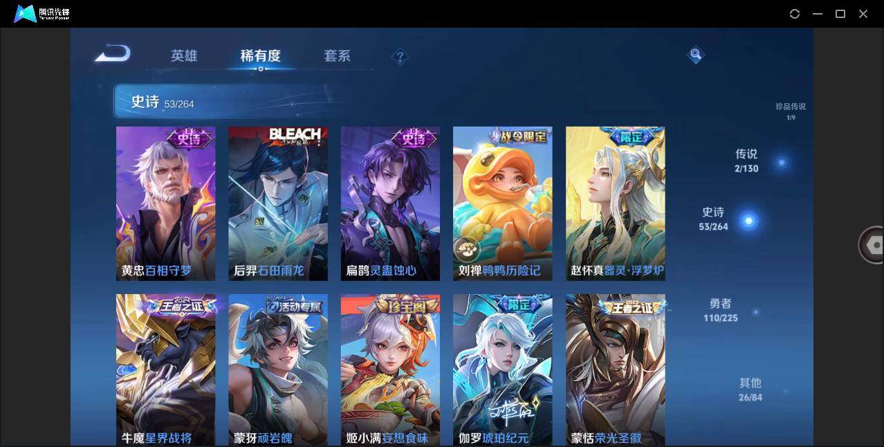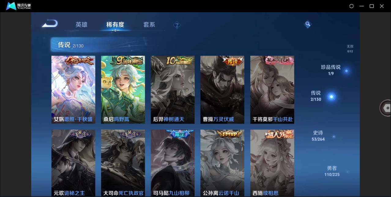 - [12142741]V9 3典藏 16传说 125英雄 264皮肤 典藏英雄武则天 可修改实名 优质装备:无限飓风号(高达),大秦宣太后,鸣剑·曳影,黄金射手座,冠军飞将,云鹰飞将(小将军),猫影幻舞,炽阳神光,一念神魔,云霓雀翎,末日机甲-孙尚香(绿蚂蚱),海洋之心,李逍遥,淬星耀世,山海·苍雷引(电光曜子) 珍宝阁皮:优雅恋人,女武神 限定皮:逐霄战戟,鸣野蒿,至尊宝,异界灵契(白毛香),傲雪梅枪,飞衡(韩信年限),遇见飞天,高山流水,五谷丰年,青龙志(铠年限),冰锋战神,天狼运算者,梁祝,天狼狩猎者,李小龙,朱雀志(守约年限),辉光之辰,如梦令-嫦娥,如梦令-后羿,霸王别姬-项羽,霸王别姬-虞姬,孙行者,一生所爱,引擎之心,天魔缭乱,云端筑梦师,乒乒小将,女儿国国王,寅虎·御盾(廉颇年限) 史诗皮:紫霞仙子,苍穹之光,电玩小子(小书包),黄金分割率,永昼,魅语,冰冠公主,偶像歌手,晚萤,猫狗日记-孙策,时之恋人-孙尚香,乱世虎臣,节奏热浪,修罗,女仆咖啡,水果甜心,绅士熊喵,天才门将,星夜王子,心灵骇客,功夫厨神,德古拉伯爵,暗隐猎兽者,幽灵船长,鬼剑武藏,舞动绿茵,地狱岩魂,纤云弄巧,繁星吟游(呼啦呼啦),拒霜思,缤纷独角兽,逐浪之夏,龙鼓争鸣,水晶猎龙者,曙光守护者,金属风暴,原初追逐者,圣诞恋歌,鹰眼统帅,王者之锤,魅力维加斯,黎明之约,寅虎·御盾,未来纪元-赵云
