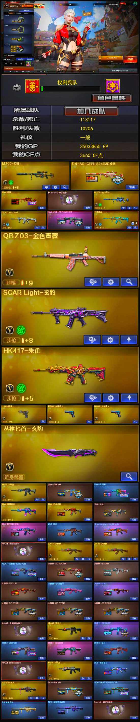 【稀有皮肤】:幻神-丹凤,幻神-AG-CFPL S24冠军 皮肤,白虎-白鲨-CFPLS23冠军,雷神-荣耀之魄,雷神-虎将,雷神-传奇N9,火麒麟-AG战队皮肤,AK47-火麒麟-传奇EVEN,火麒麟-轻羽皮肤,火麒麟-平天大圣,火麒麟-百城,火麒麟-心动糖果,黑骑士-暗月,黑骑士-战神马超,黑骑士-CFS2021,毁灭-荣耀之怒,毁灭耀金皮肤,毁灭-BEAN-2020MVP,AWM-天龙-传奇70KG,AWM-天龙-传奇白鲨,修罗-CF STAR,修罗-冠军之魂,屠龙-荣耀之锋*2