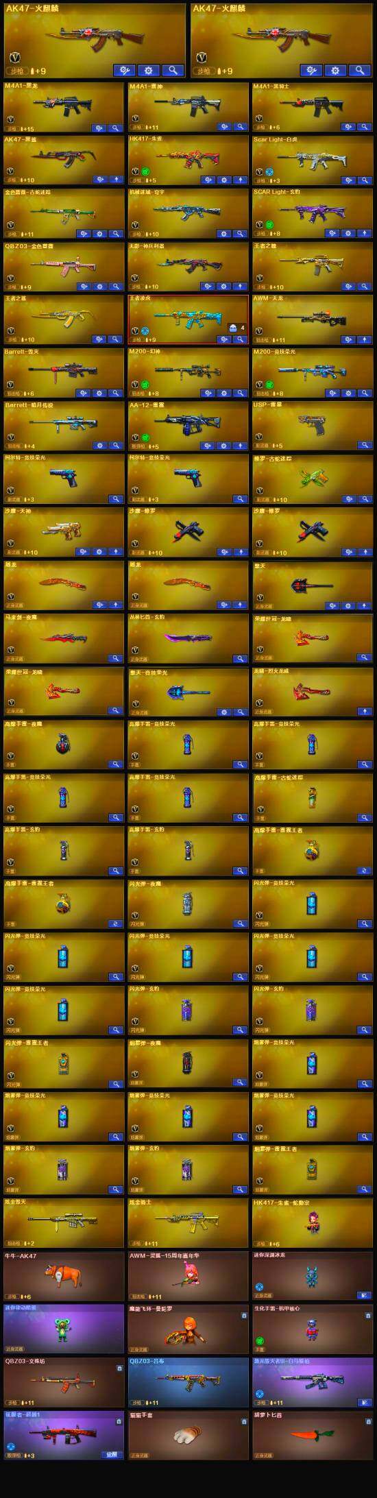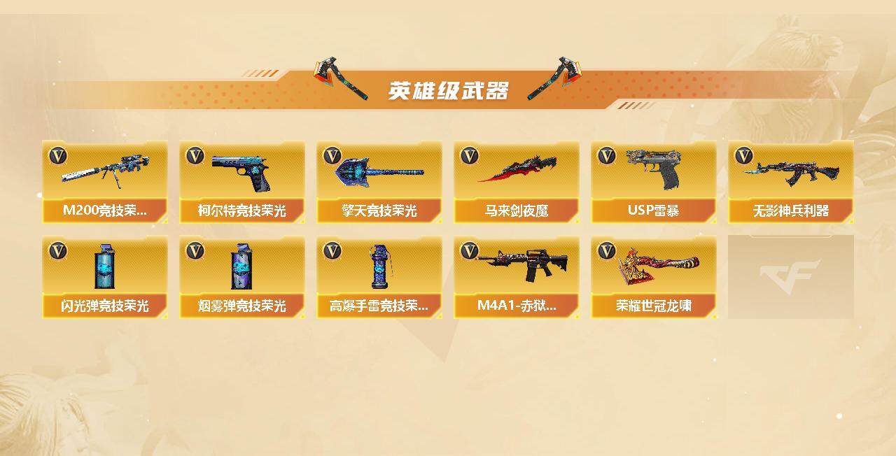 【英雄级武器】:M200-竞技荣光,柯尔特-竞技荣光*2,擎天-竞技荣光,高爆手雷-竞技荣光*4,烟雾弹-竞技荣光*4,闪光弹-竞技荣光*5,马来剑-夜魔,USP-雷暴,荣耀世冠-龙啸*2,QBZ03-金色蔷薇,Scar Light-白虎,HK417-朱雀,金色蔷薇-古蛇迷踪,无影-神兵利器,M4A1-雷神,M4A1-黑龙,M4A1-黑骑士,AK47-火麒麟*2,AWM-天龙,Barrett-毁灭,AA-12-雷霆,M200-幻神,AK47-黑鲨,M4A1-赤狱骑士,修罗-古蛇迷踪,沙鹰-天神,沙鹰-修罗*2,擎天,屠龙*2
