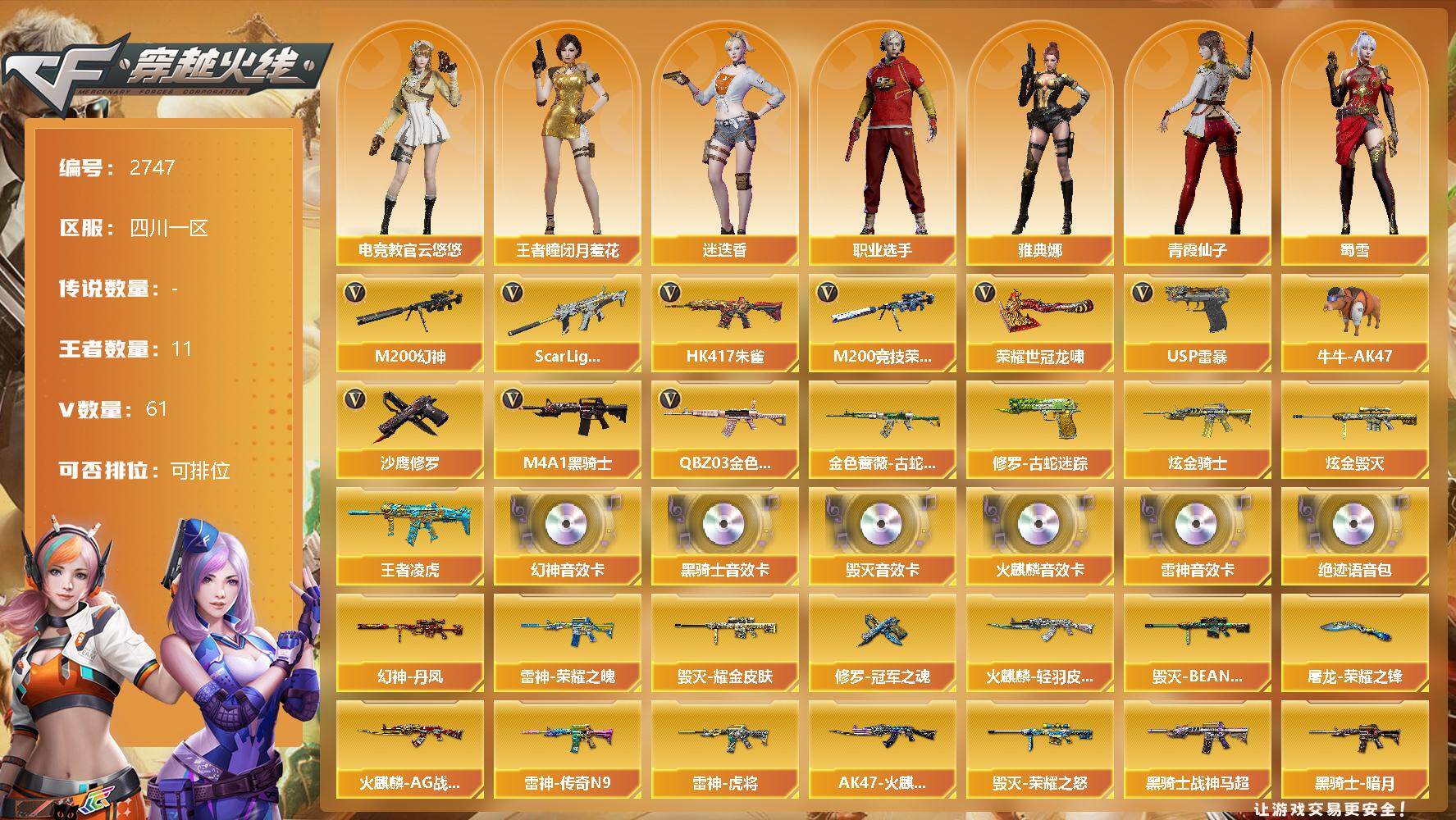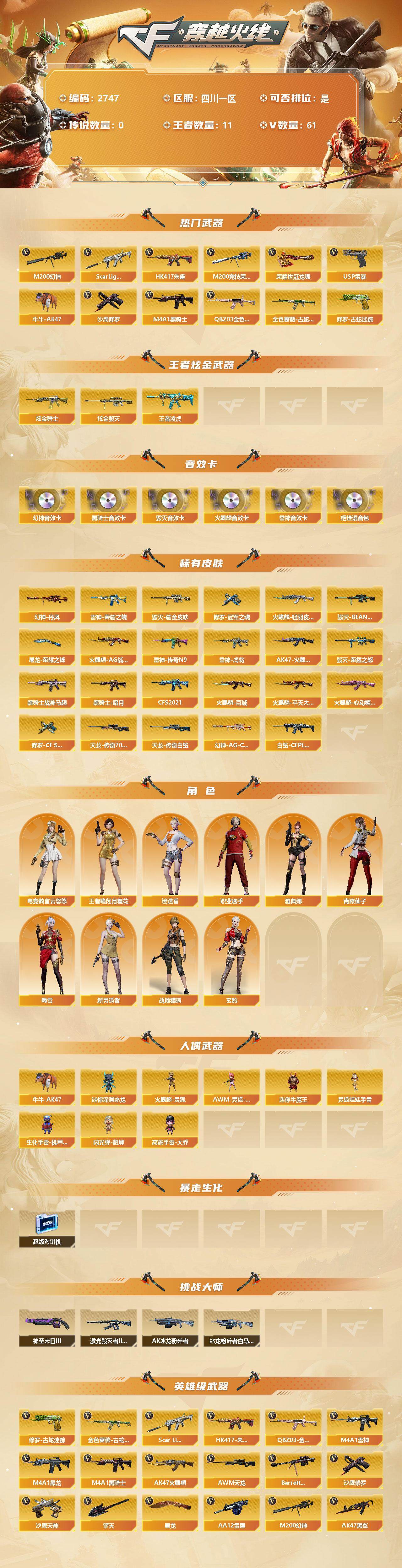[12959095]四川一区-61V-11王者-2炫金 【热门武器】:QBZ03-金色蔷薇,Scar Light-白虎,HK417-朱雀,M200-幻神,金色蔷薇-古蛇迷踪,修罗-古蛇迷踪,M200-竞技荣光,牛牛-AK47,M4A1-黑骑士,USP-雷暴,沙鹰-修罗*2,荣耀世冠-龙啸*2 【王者炫金武器】:炫金骑士,炫金毁灭,王者凌虎 【音效卡】:M200-幻神音效卡,AK47-火麒麟音效卡,M4A1-雷神音效卡,M4A1-黑骑士音效卡,Barrett-毁灭音效卡,绝迹语音包 【稀有皮肤】:幻神-丹凤,幻神-AG-CFPL S24冠军 皮肤,白虎-白鲨-CFPLS23冠军,雷神-荣耀之魄,雷神-虎将,雷神-传奇N9,火麒麟-AG战队皮肤,AK47-火麒麟-传奇EVEN,火麒麟-轻羽皮肤,火麒麟-平天大圣,火麒麟-百城,火麒麟-心动糖果,黑骑士-暗月,黑骑士-战神马超,黑骑士-CFS2021,毁灭-荣耀之怒,毁灭耀金皮肤,毁灭-BEAN-2020MVP,AWM-天龙-传奇70KG,AWM-天龙-传奇白鲨,修罗-CF STAR,修罗-冠军之魂,屠龙-荣耀之锋*2 【角色】:王者-瞳-闭月羞花,雅典娜,迷迭香,电竞教官-云悠悠,战地猎狐,玄豹,蜀雪,新灵狐者,职业选手,青霞仙子 【人偶武器】:火麒麟-灵狐,AWM-灵狐-15周年嘉年华,牛牛-AK47,迷你深渊冰龙,迷你牛魔王,灵狐娃娃手雷,生化手雷-机甲核心,闪光弹-貂蝉,高爆手雷-大乔 【暴走生化】:超级对讲机 【挑战大师】:神圣爆裂者-末日III,激光毁灭者III-白马银枪,AK47-冰龙粉碎者,冰龙粉碎者-白马银枪 【英雄级武器】:M200-竞技荣光,柯尔特-竞技荣光*2,擎天-竞技荣光,高爆手雷-竞技荣光*4,烟雾弹-竞技荣光*4,闪光弹-竞技荣光*5,马来剑-夜魔,USP-雷暴,荣耀世冠-龙啸*2,QBZ03-金色蔷薇,Scar Light-白虎,HK417-朱雀,金色蔷薇-古蛇迷踪,无影-神兵利器,M4A1-雷神,M4A1-黑龙,M4A1-黑骑士,AK47-火麒麟*2,AWM-天龙,Barrett-毁灭,AA-12-雷霆,M200-幻神,AK47-黑鲨,M4A1-赤狱骑士,修罗-古蛇迷踪,沙鹰-天神,沙鹰-修罗*2,擎天,屠龙*2 【特殊枪械】:1白虎,1黑骑士