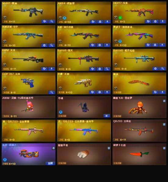 【英雄级武器】:COP 357-云龙,HK417-朱雀,无影-神兵利器,M4A1-雷神,AN94-超新星,AWM-天龙,Barrett-毁灭,黑武士-锦绣游龙,AK-47-猩红传说,沙鹰-天神,屠龙