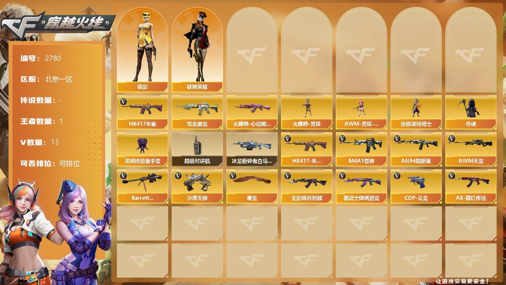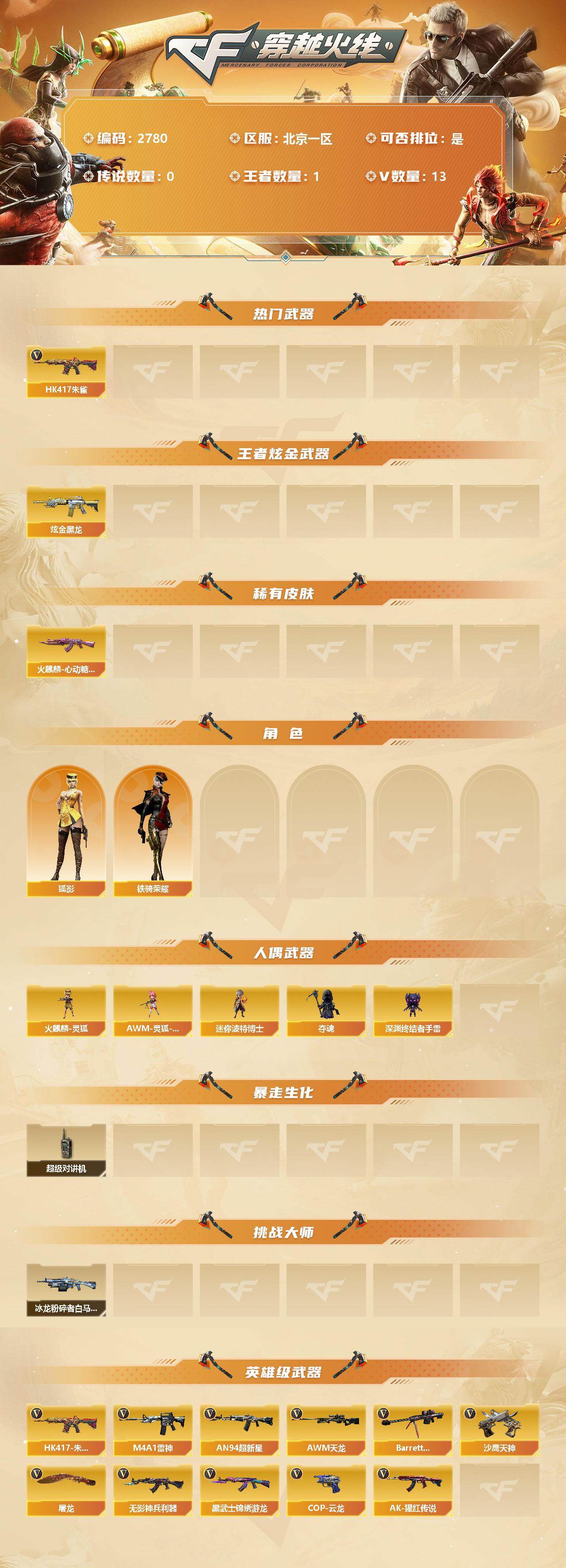 [12959421]北京一区-13V-1王者-1炫金 【热门武器】:HK417-朱雀 【王者炫金武器】:炫金黑龙 【稀有皮肤】:火麒麟-心动糖果 【角色】:狐影,铁骑荣耀 【人偶武器】:火麒麟-灵狐,AWM-灵狐-15周年嘉年华,迷你波特博士,夺魂,深渊终结者手雷 【暴走生化】:超级对讲机 【挑战大师】:冰龙粉碎者-白马银枪 【英雄级武器】:COP 357-云龙,HK417-朱雀,无影-神兵利器,M4A1-雷神,AN94-超新星,AWM-天龙,Barrett-毁灭,黑武士-锦绣游龙,AK-47-猩红传说,沙鹰-天神,屠龙 【特殊枪械】:
