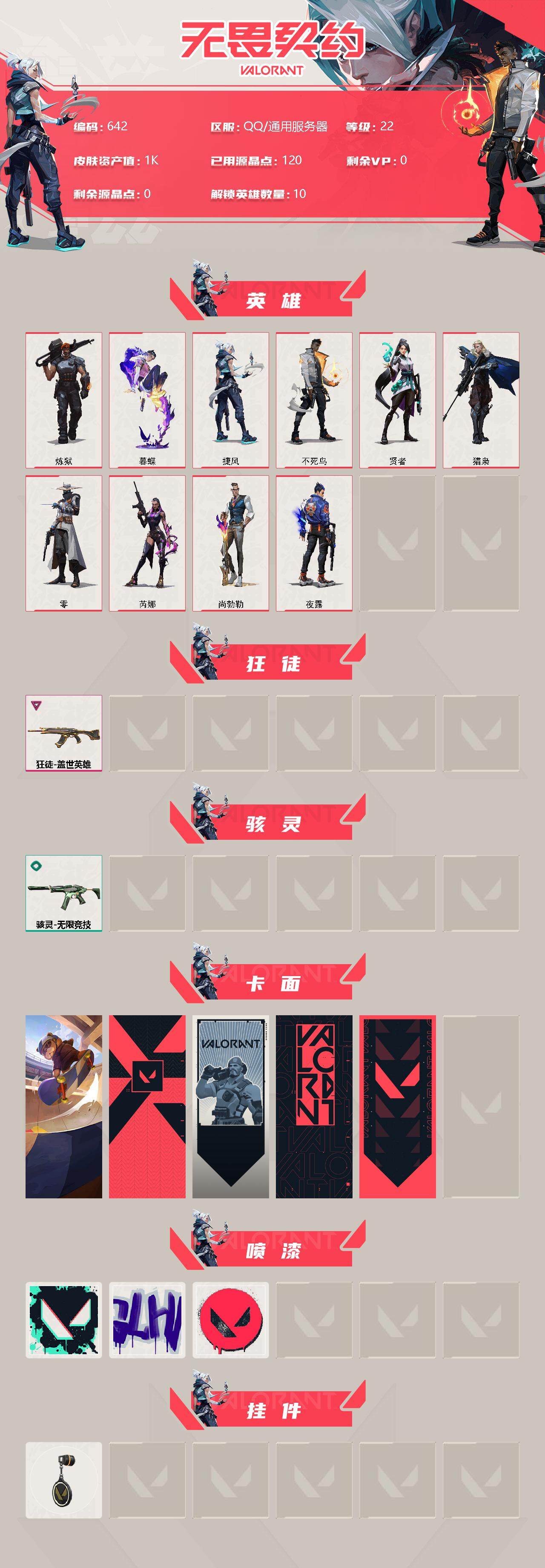 [12959210]【英雄】:炼狱,暮蝶,捷风,不死鸟,贤者,猎枭,零,芮娜,尚勃勒,夜露 【狂徒】:狂徒-盖世英雄 【骇灵】:骇灵-无限竞技 【卡面】:Clutch 卡面,代号红色 卡面,新兵报到 卡面,V契约 卡面,无畏契约 卡面 【喷漆】:胜利属于无畏契约 喷漆,GLHF 喷漆,无畏契约 喷漆 【挂饰】:无畏契约 纪念币 挂饰